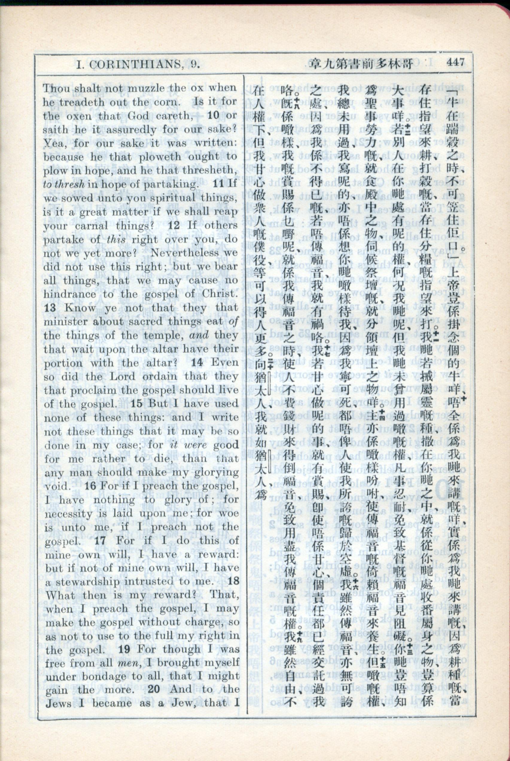 1931年新約全書廣東話新譯本與美國新譯英文 哥林多前書 9 章 10 節到 9 章 20 節