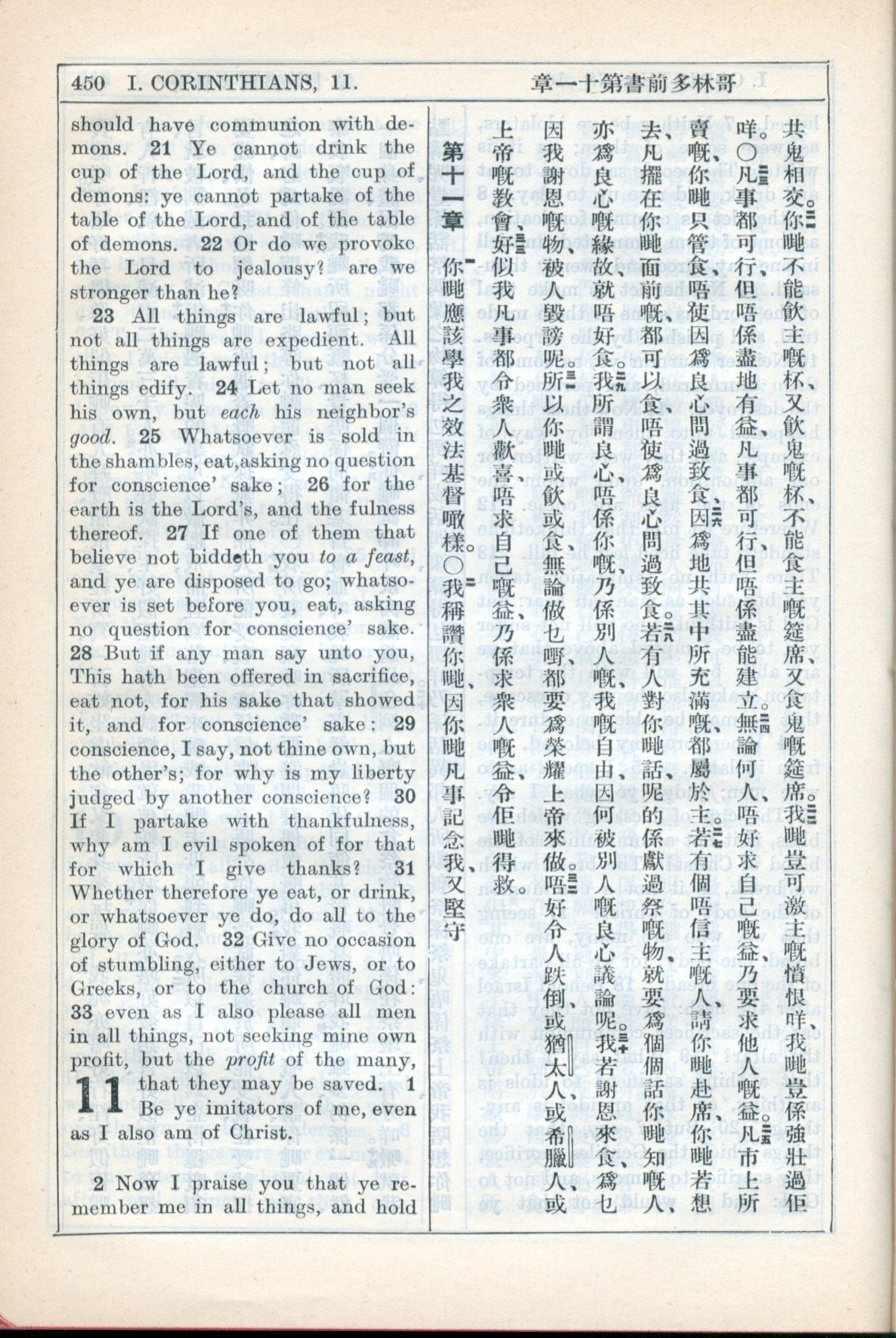 1931年新約全書廣東話新譯本與美國新譯英文 哥林多前書 10 章 21 節到 11 章 2 節