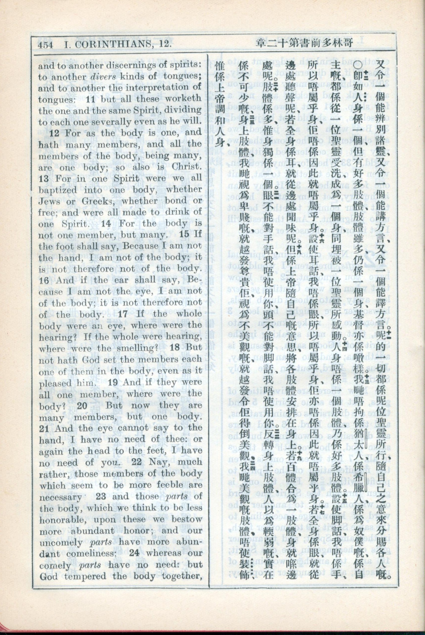1931年新約全書廣東話新譯本與美國新譯英文 哥林多前書 12 章 11 節到 12 章 24 節