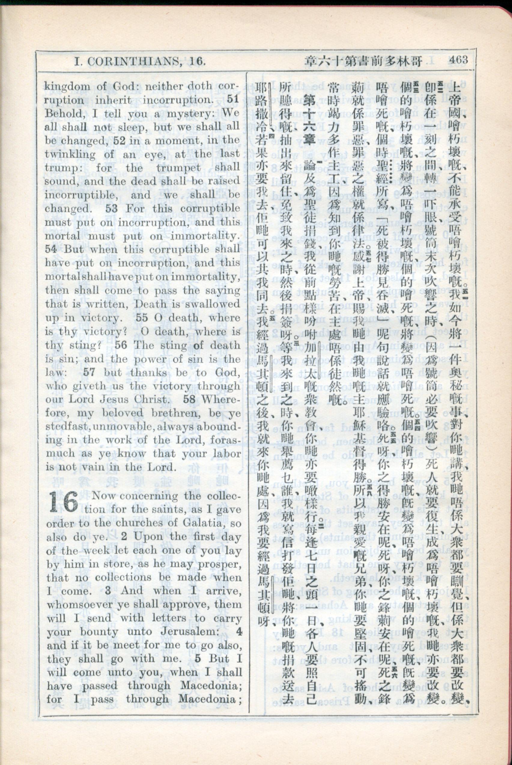 1931年新約全書廣東話新譯本與美國新譯英文 哥林多前書 15 章 51 節到 16 章 5 節