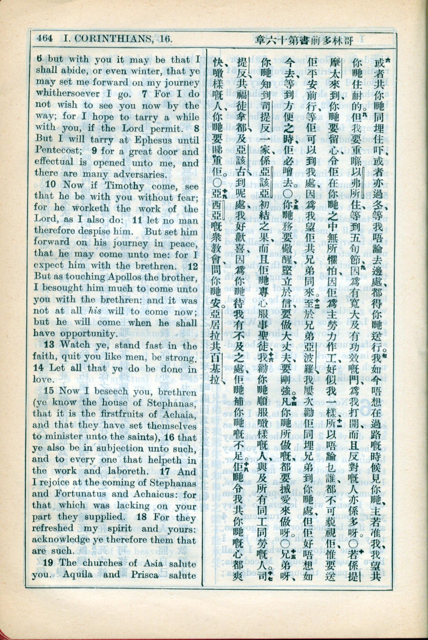 1931年新約全書廣東話新譯本與美國新譯英文 哥林多前書 16 章 6 節到 16 章 19 節