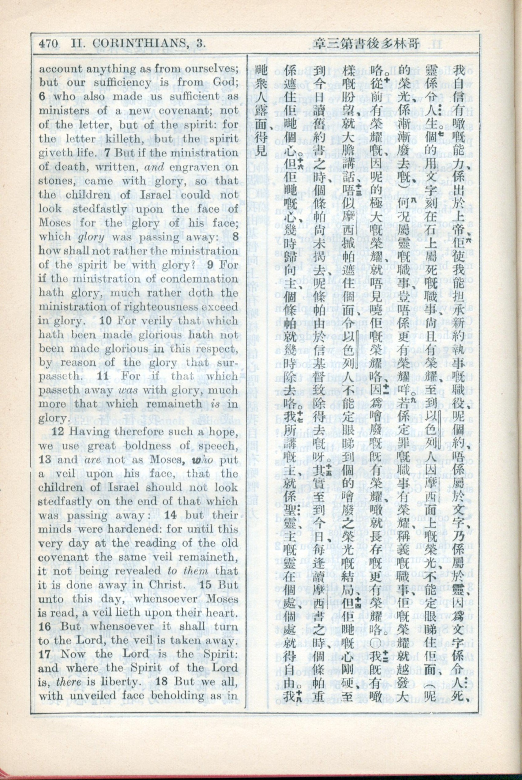 1931年新約全書廣東話新譯本與美國新譯英文 哥林多後書 3 章 6 節到 3 章 17 節