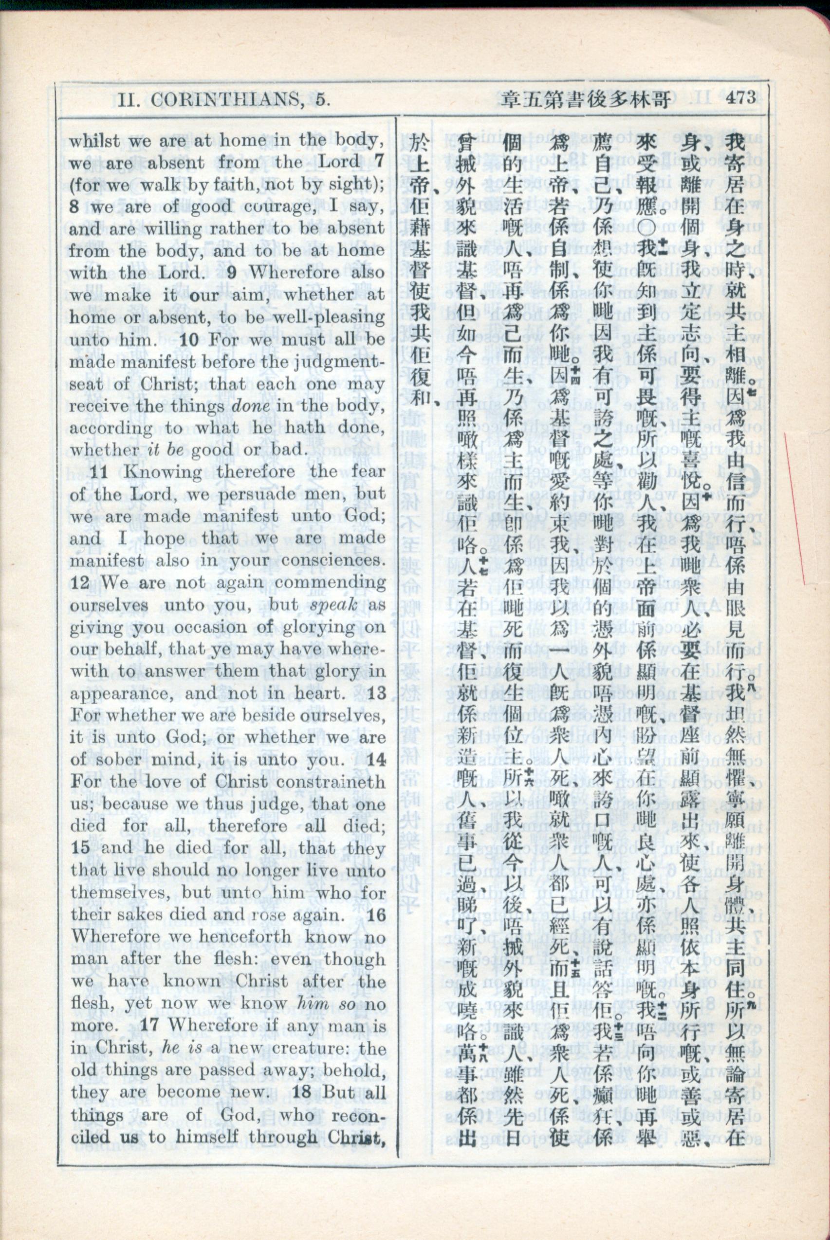1931年新約全書廣東話新譯本與美國新譯英文 哥林多後書 5 章 7 節到 5 章 18 節