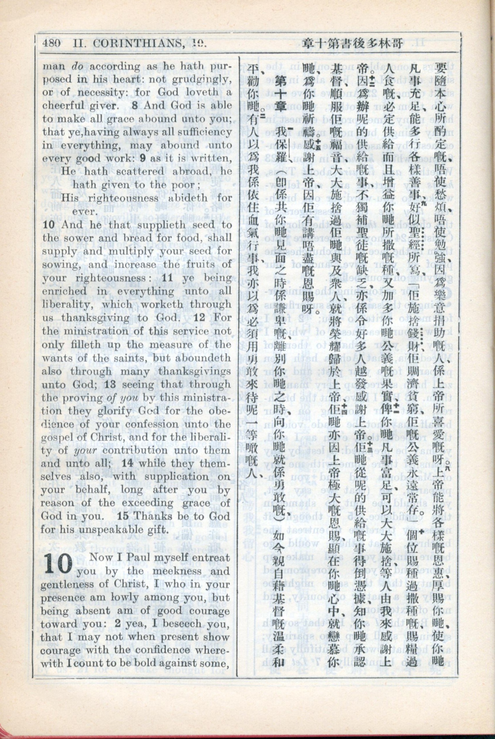 1931年新約全書廣東話新譯本與美國新譯英文 哥林多後書 9 章 7 節到 10 章 2 節