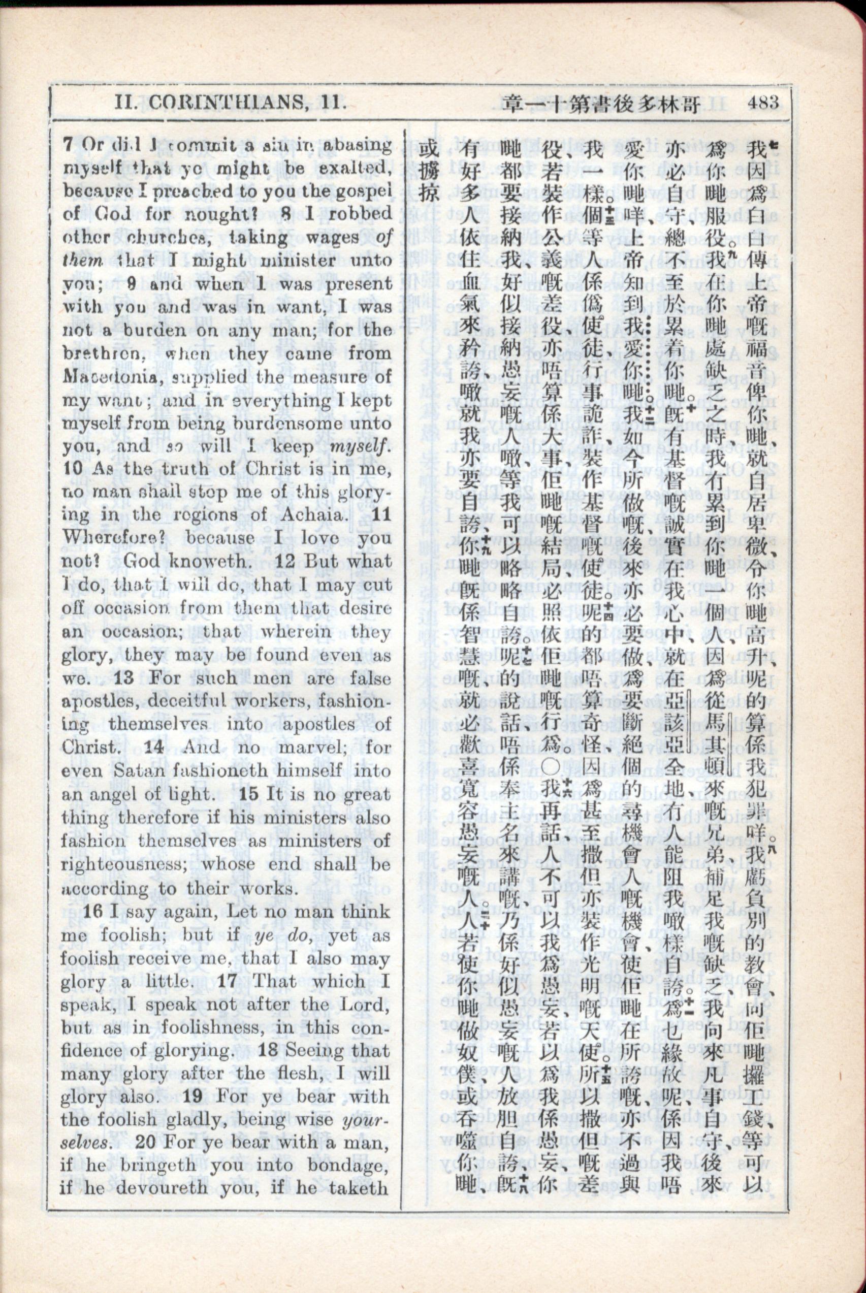 1931年新約全書廣東話新譯本與美國新譯英文 哥林多後書 11 章 7 節到 11 章 20 節