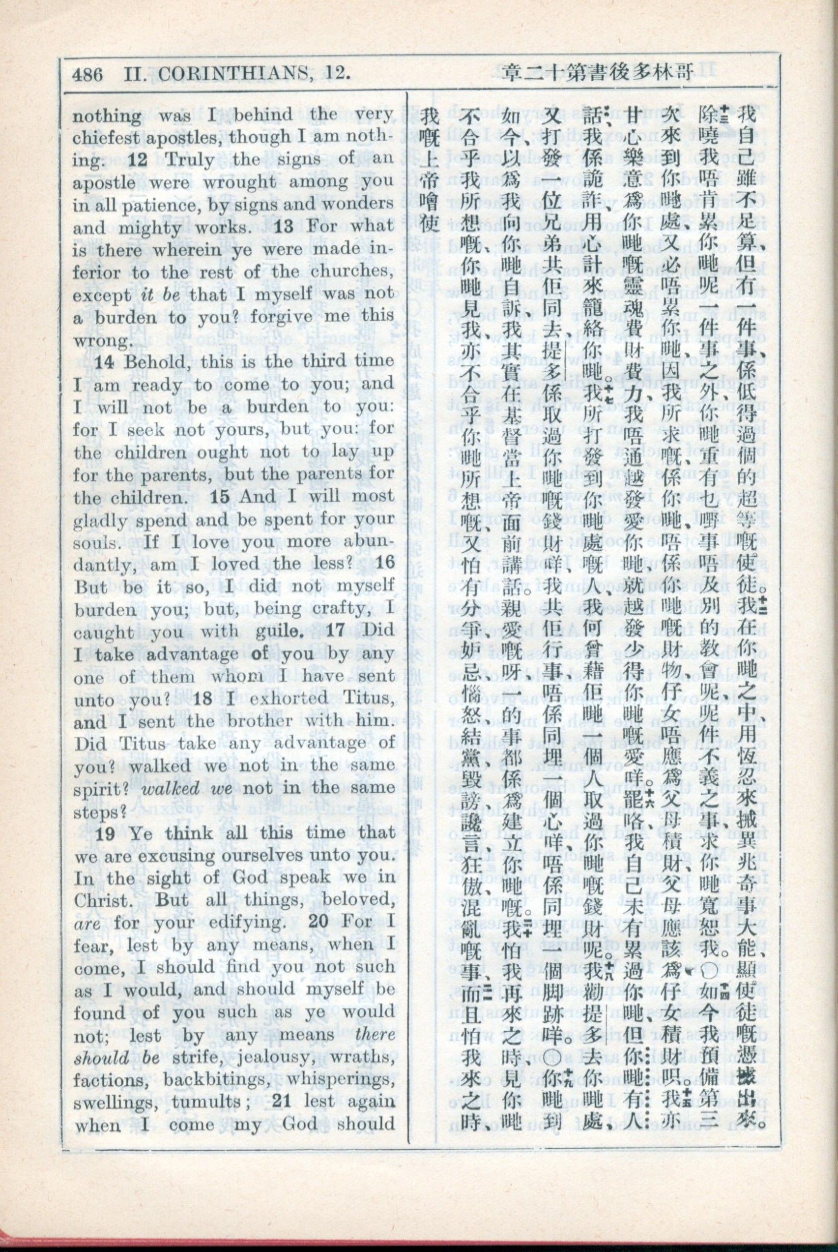 1931年新約全書廣東話新譯本與美國新譯英文 哥林多後書 12 章 12 節到 12 章 20 節