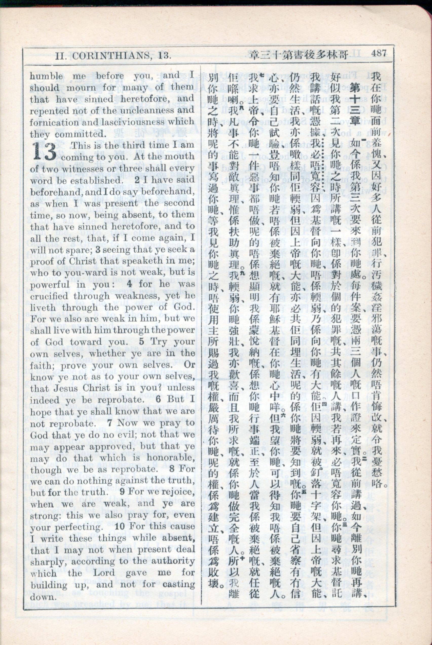1931年新約全書廣東話新譯本與美國新譯英文 哥林多後書 12 章 21 節到 13 章 10 節