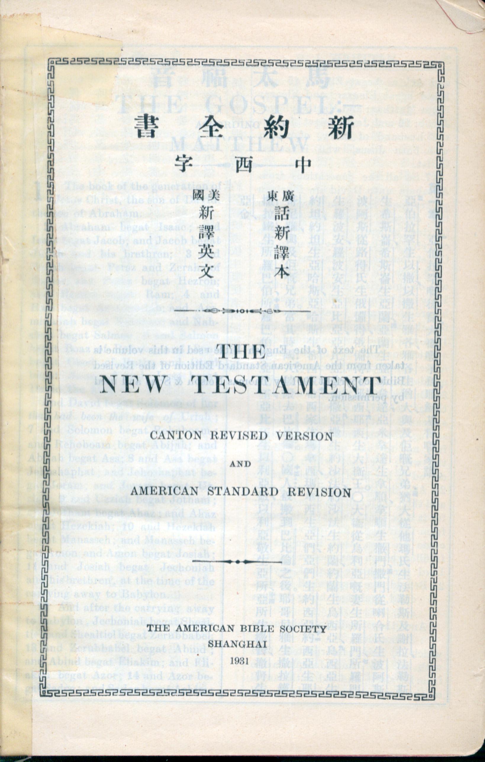 1931年新約全書廣東話新譯本與美國新譯英文 封面 0 章 4 節到 0 章 4 節