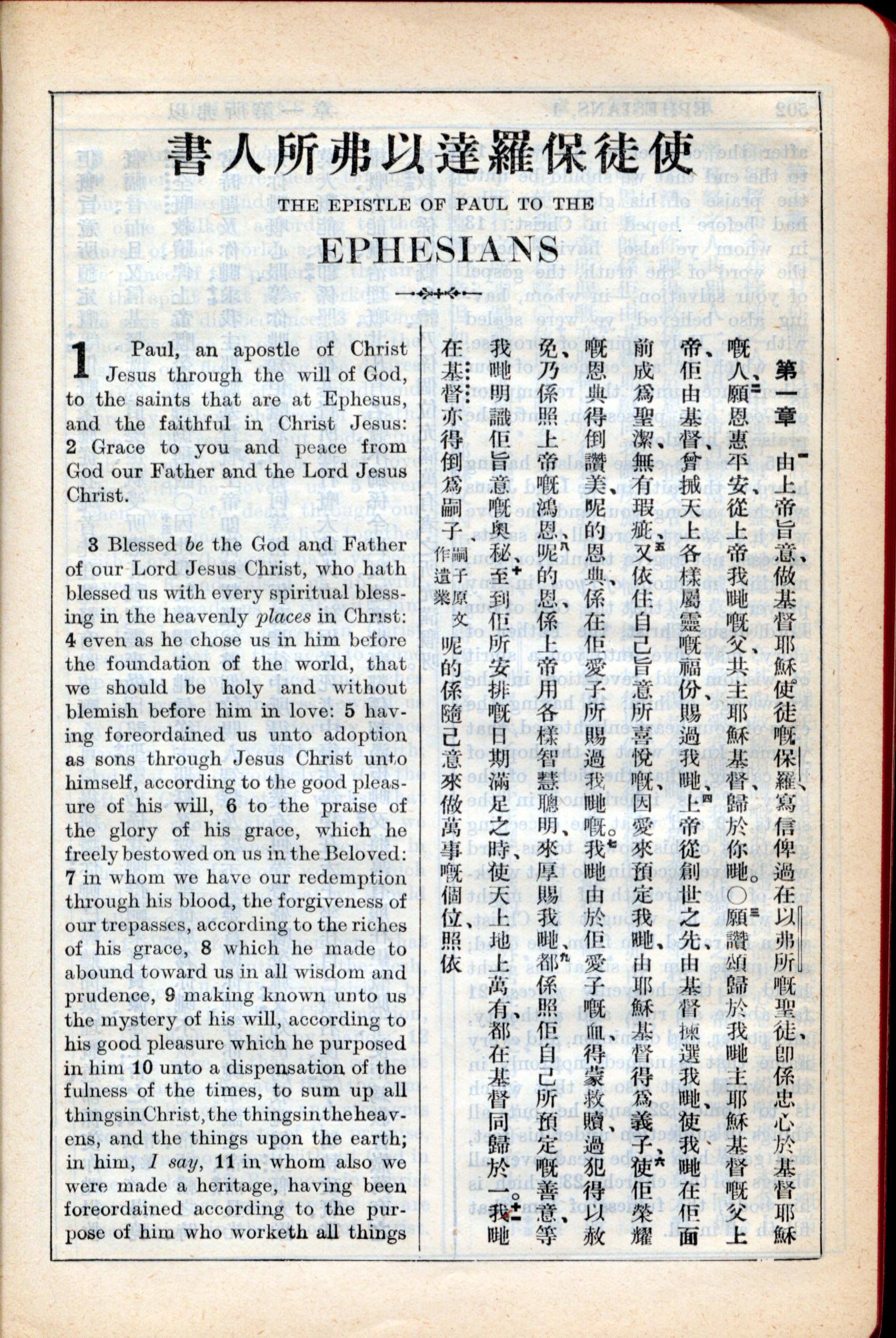 1931年新約全書廣東話新譯本與美國新譯英文 以弗所書 1 章 1 節到 1 章 11 節