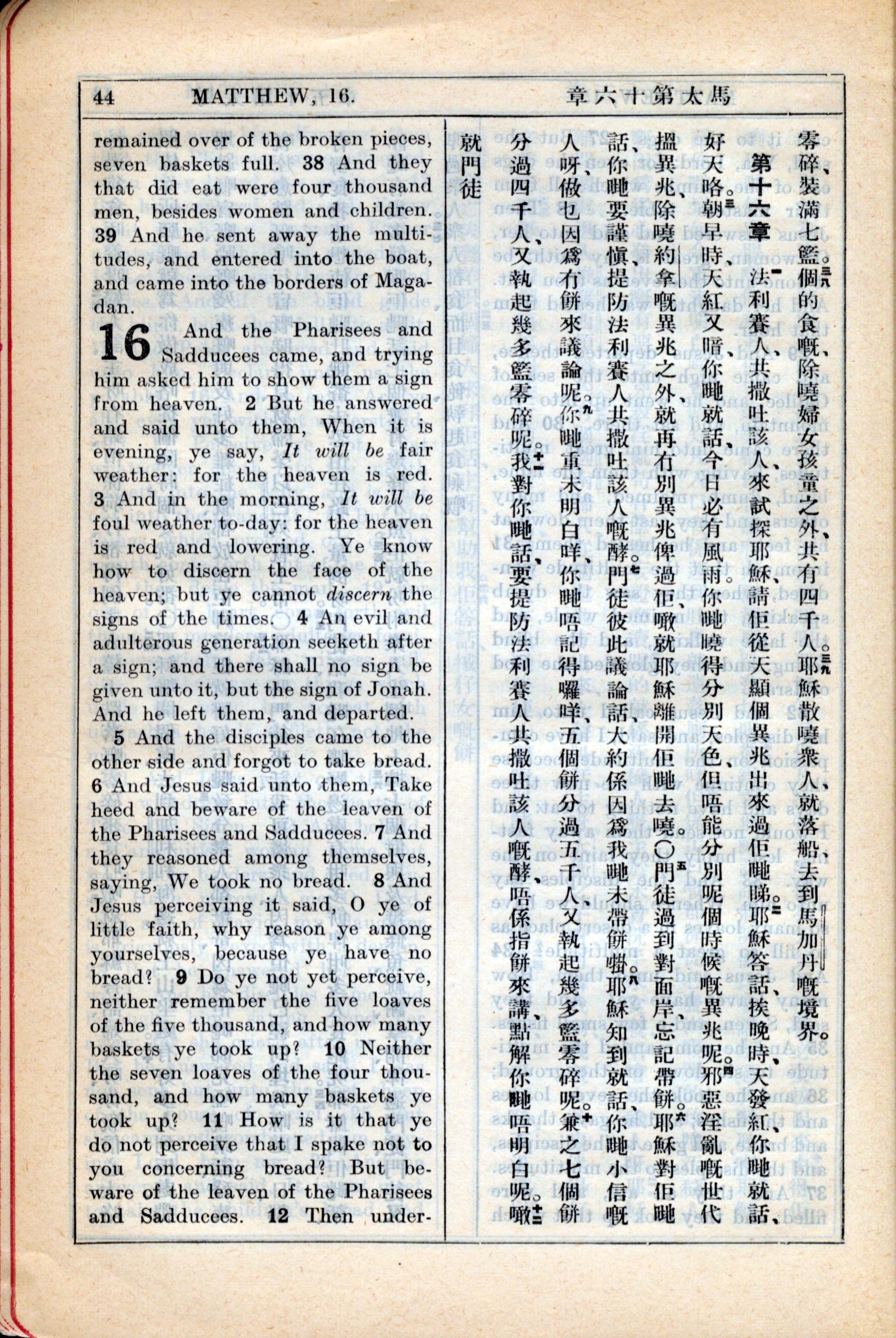 1931年新約全書廣東話新譯本與美國新譯英文 馬太福音 15 章 38 節到 16 章 11 節