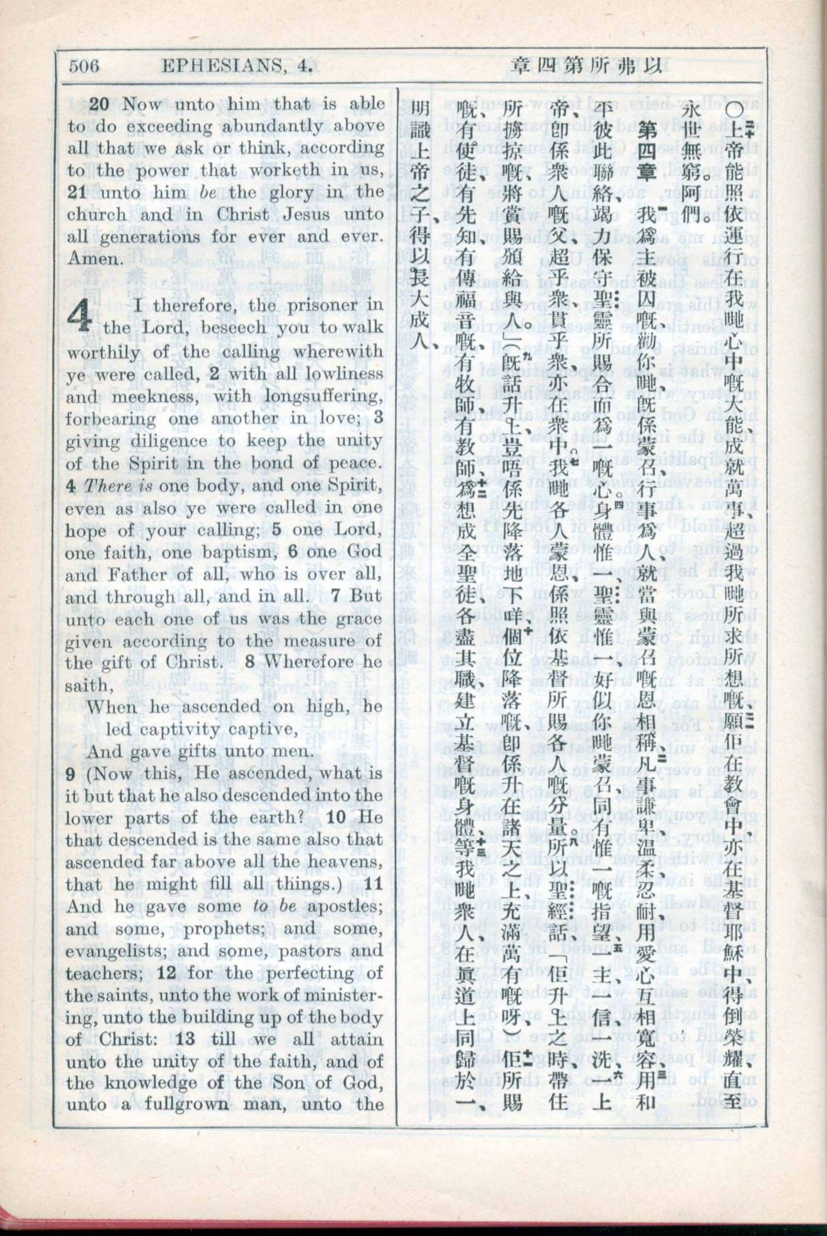 1931年新約全書廣東話新譯本與美國新譯英文 以弗所書 3 章 20 節到 4 章 13 節