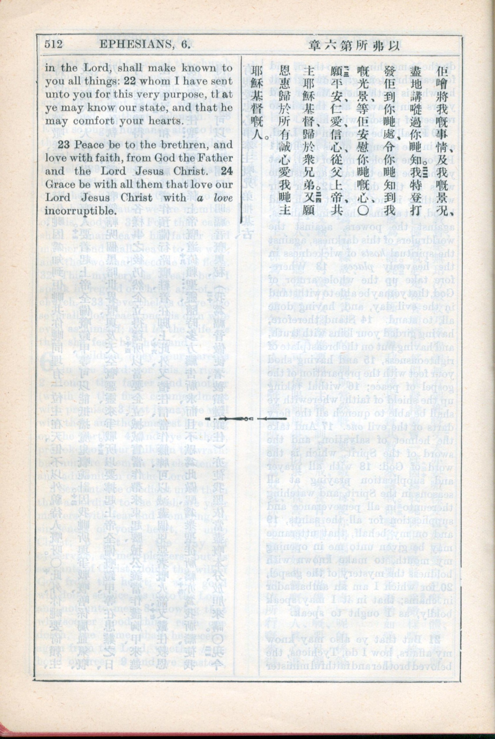 1931年新約全書廣東話新譯本與美國新譯英文 以弗所書 6 章 22 節到 6 章 24 節