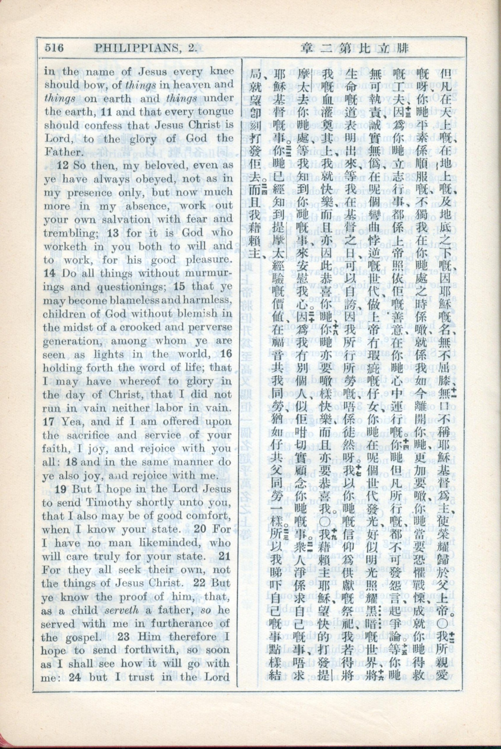 1931年新約全書廣東話新譯本與美國新譯英文 腓立比書 2 章 10 節到 2 章 24 節