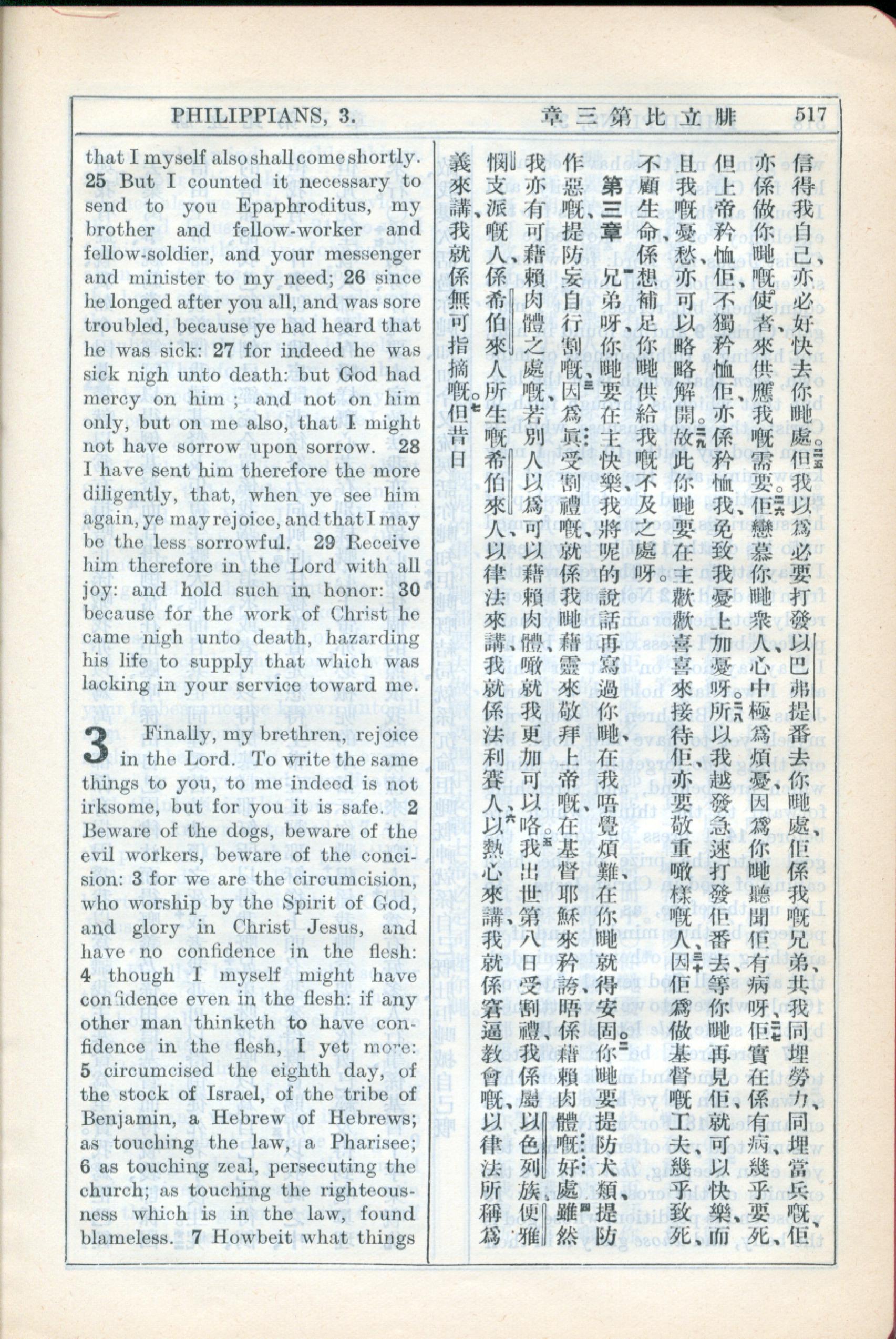 1931年新約全書廣東話新譯本與美國新譯英文 腓立比書 2 章 25 節到 3 章 7 節