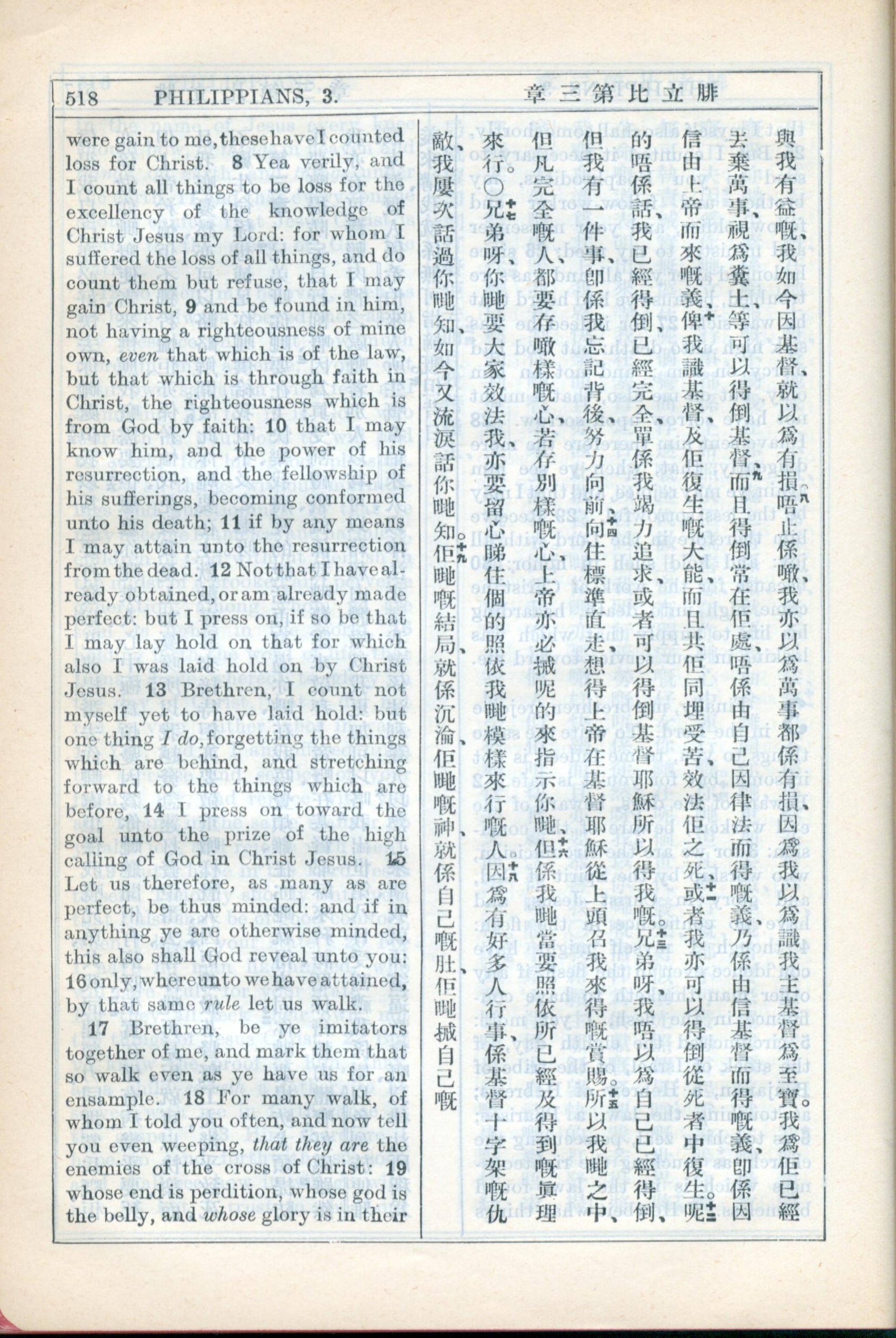 1931年新約全書廣東話新譯本與美國新譯英文 腓立比書 3 章 8 節到 3 章 19 節
