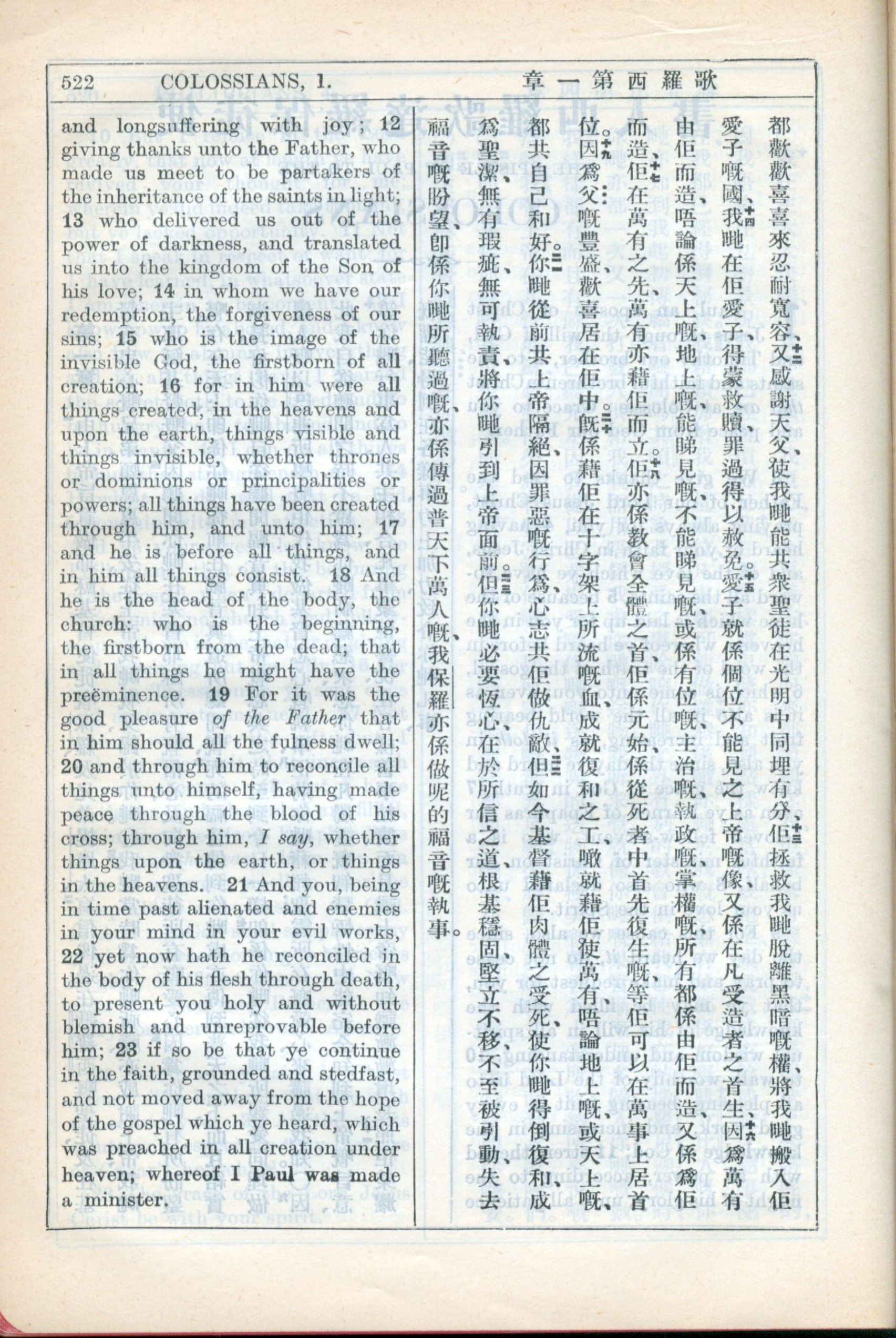 1931年新約全書廣東話新譯本與美國新譯英文 歌羅西書 1 章 12 節到 1 章 23 節