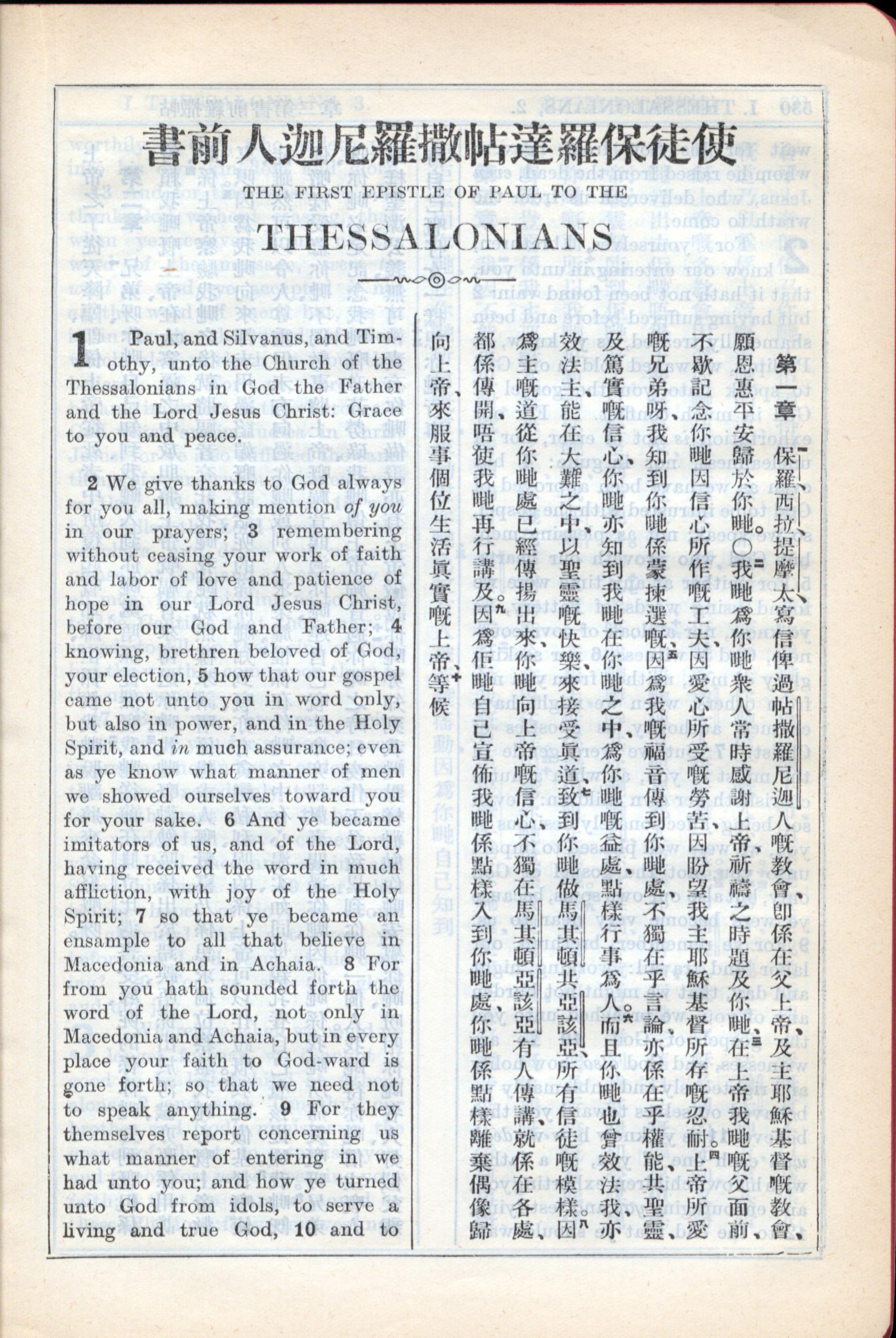 1931年新約全書廣東話新譯本與美國新譯英文 帖撒羅尼迦前書 1 章 1 節到 1 章 9 節