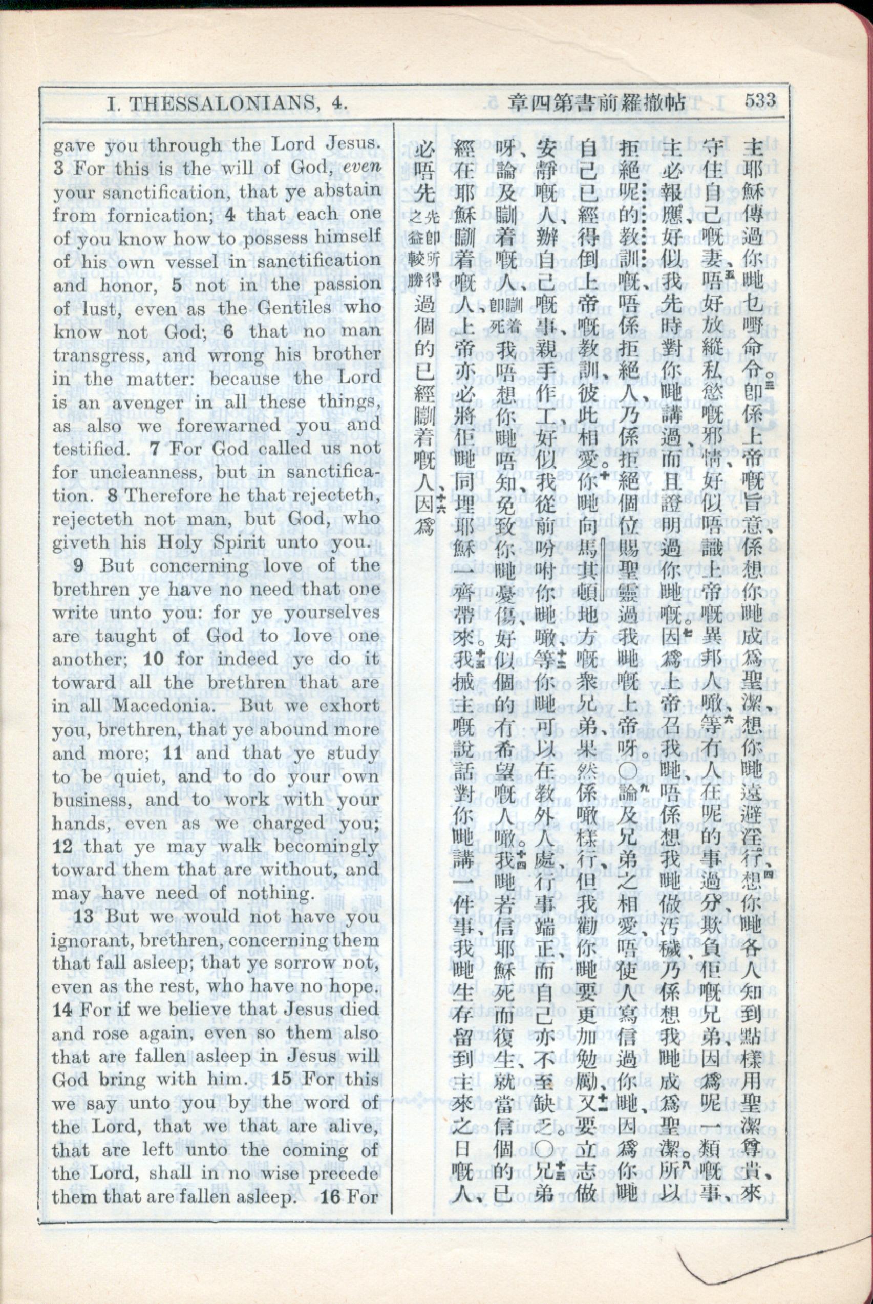1931年新約全書廣東話新譯本與美國新譯英文 帖撒羅尼迦前書 4 章 3 節到 4 章 15 節
