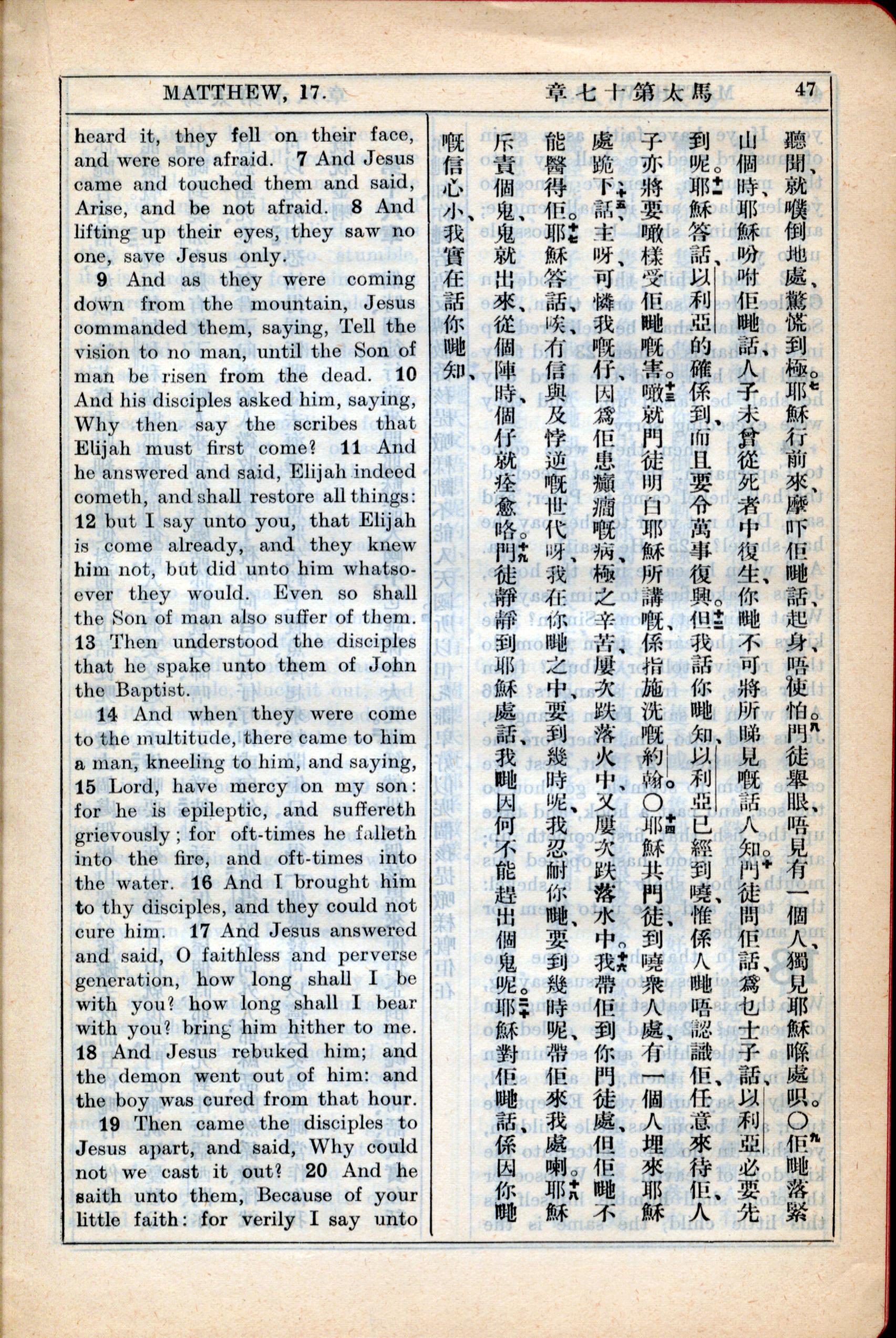 1931年新約全書廣東話新譯本與美國新譯英文 馬太福音 17 章 6 節到 17 章 20 節