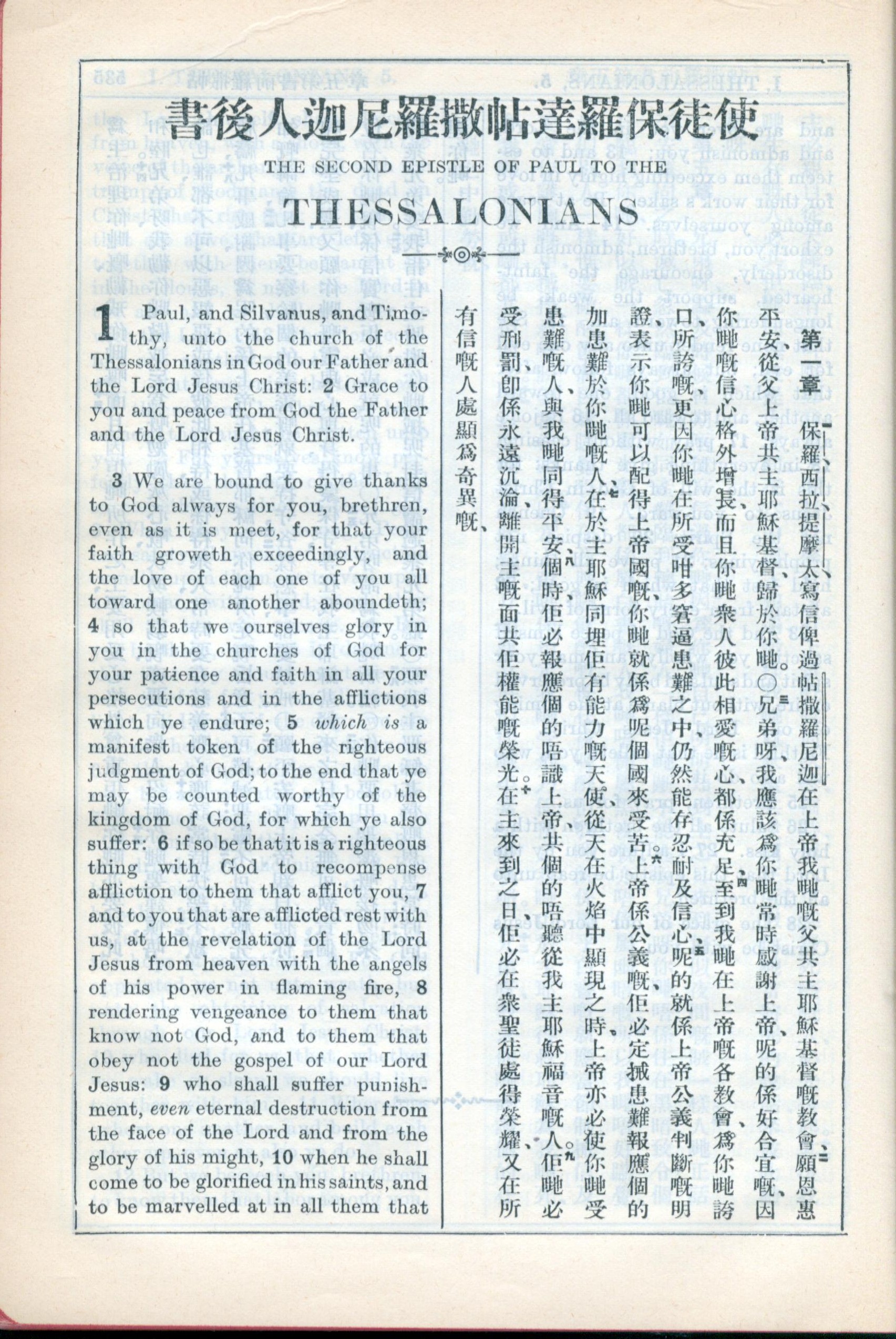 1931年新約全書廣東話新譯本與美國新譯英文 帖撒羅尼迦後書 1 章 1 節到 1 章 10 節