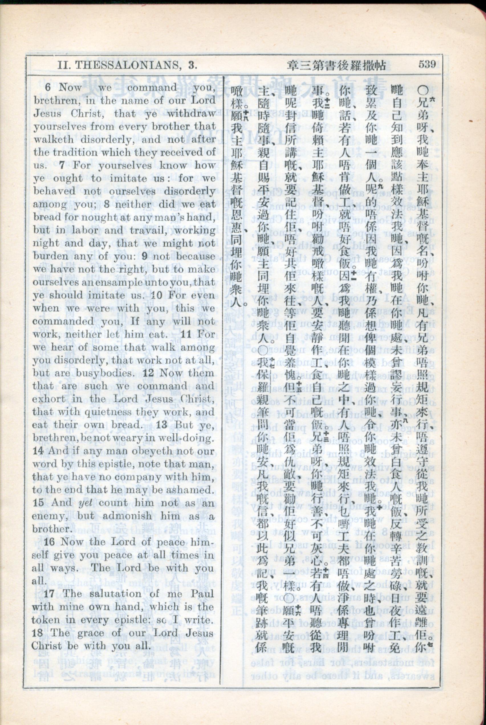 1931年新約全書廣東話新譯本與美國新譯英文 帖撒羅尼迦後書 3 章 6 節到 3 章 18 節