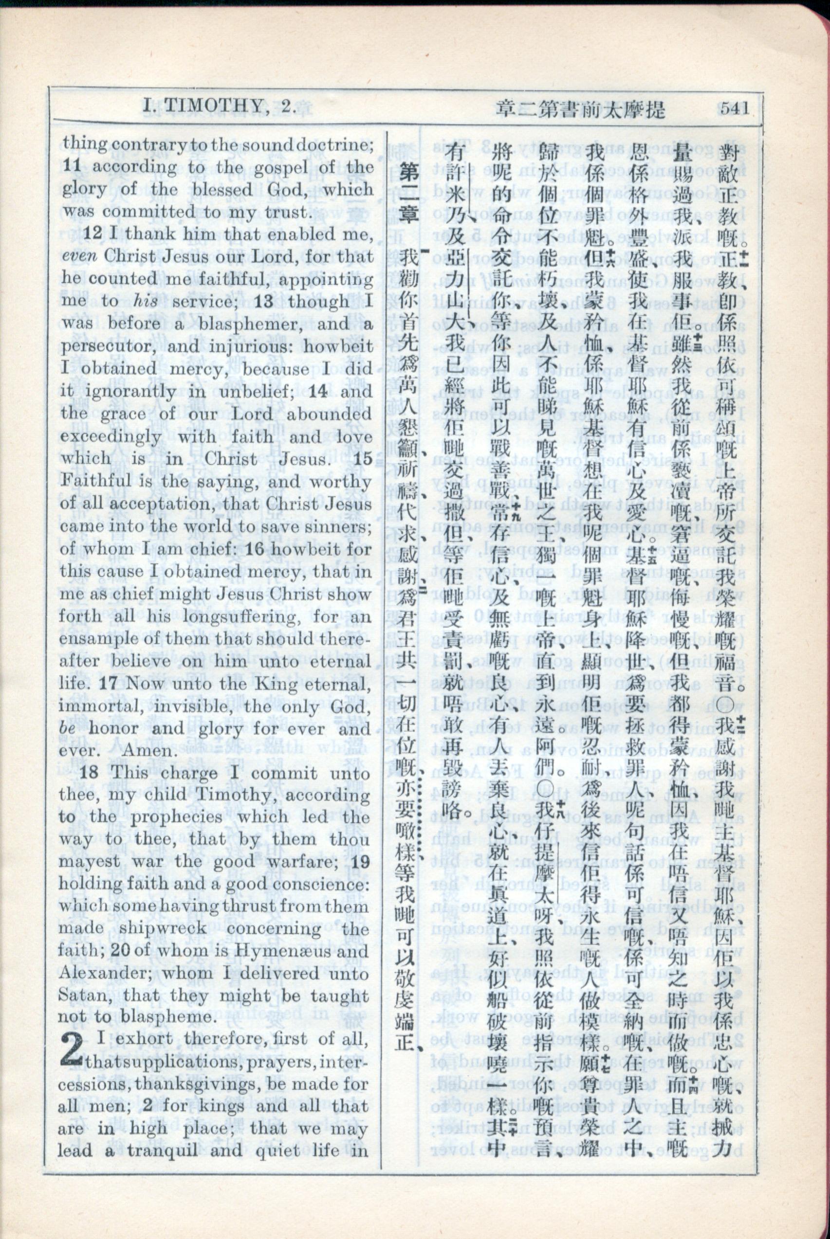 1931年新約全書廣東話新譯本與美國新譯英文 提摩太前書 1 章 11 節到 2 章 2 節