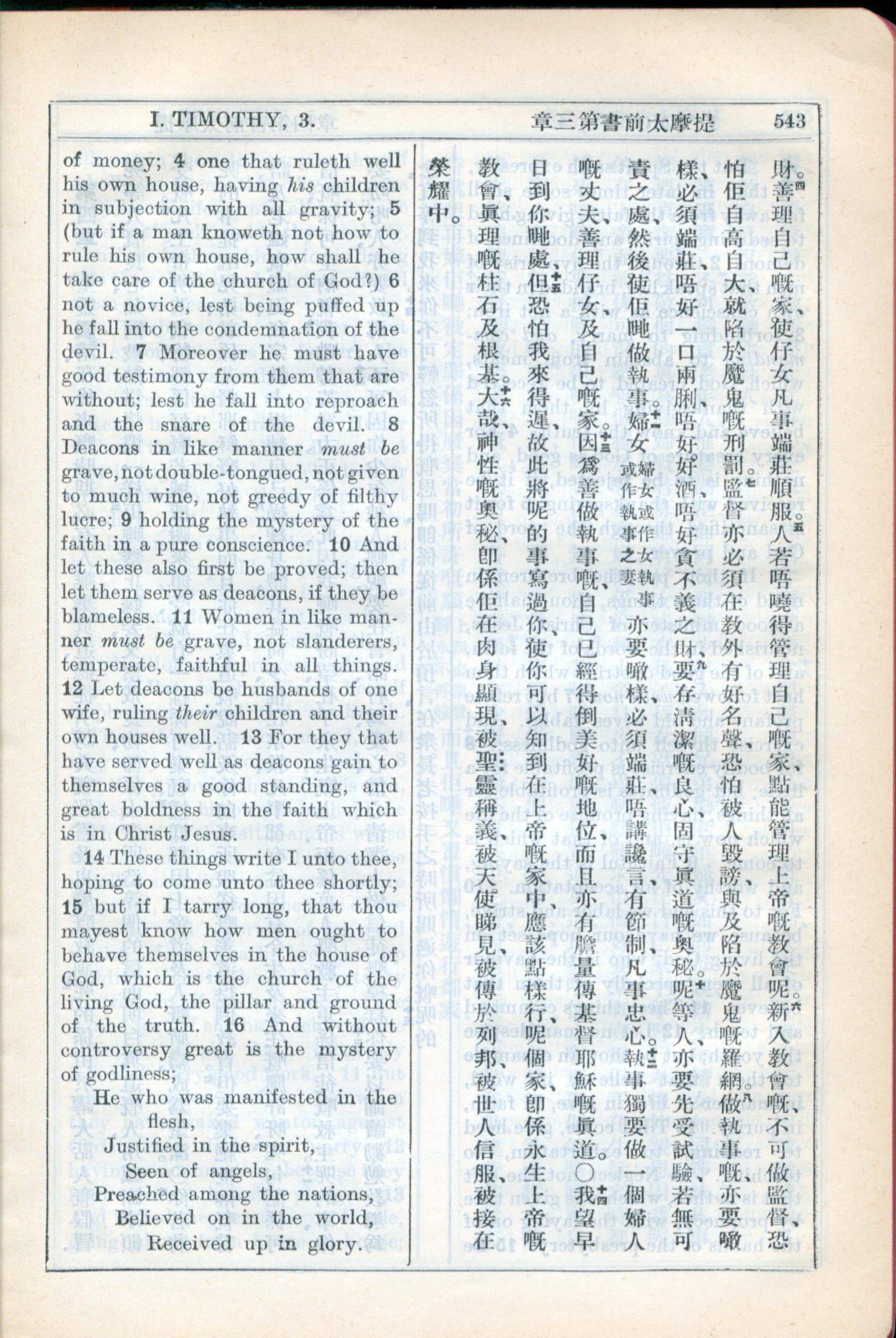 1931年新約全書廣東話新譯本與美國新譯英文 提摩太前書 3 章 4 節到 3 章 16 節