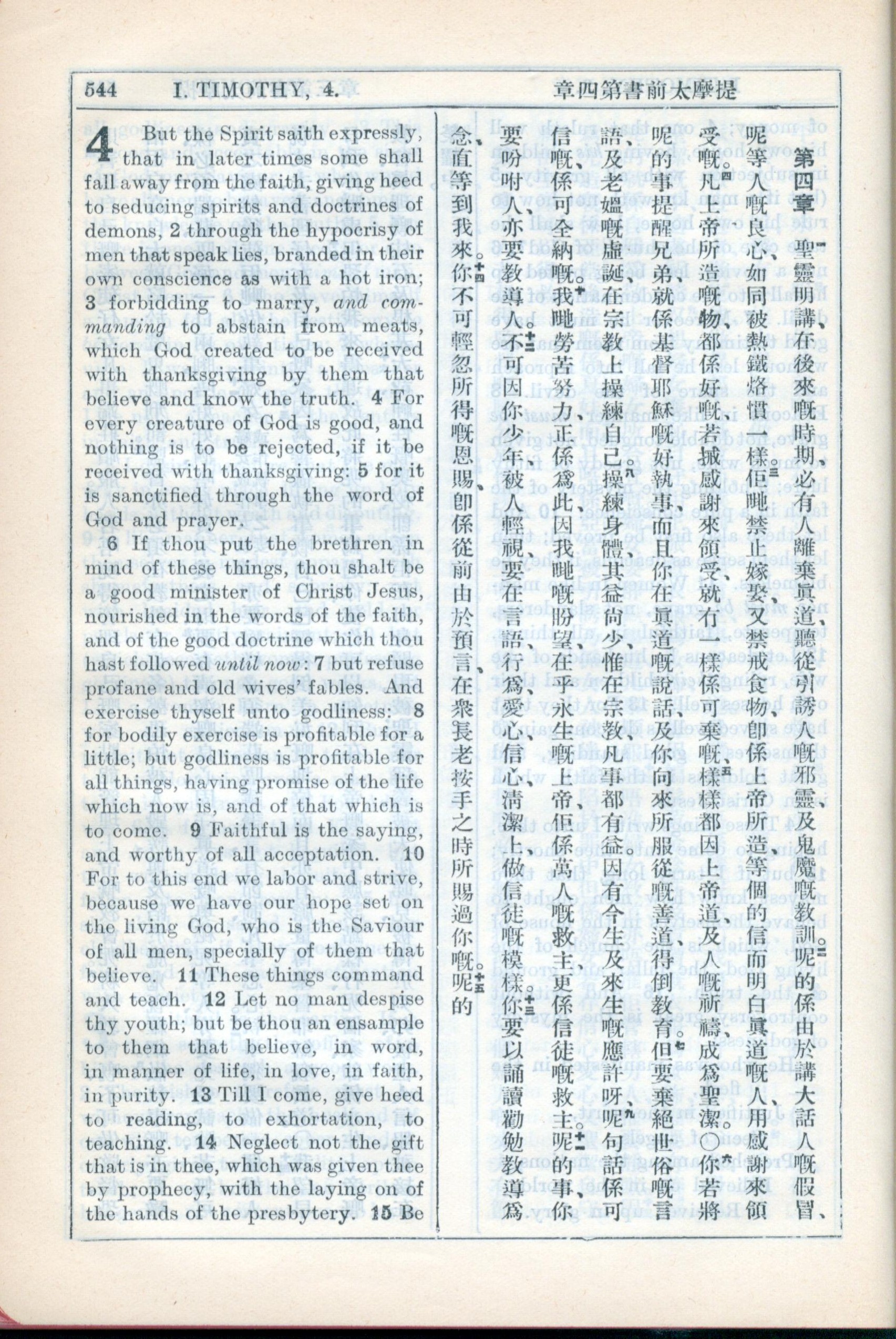 1931年新約全書廣東話新譯本與美國新譯英文 提摩太前書 4 章 1 節到 4 章 14 節