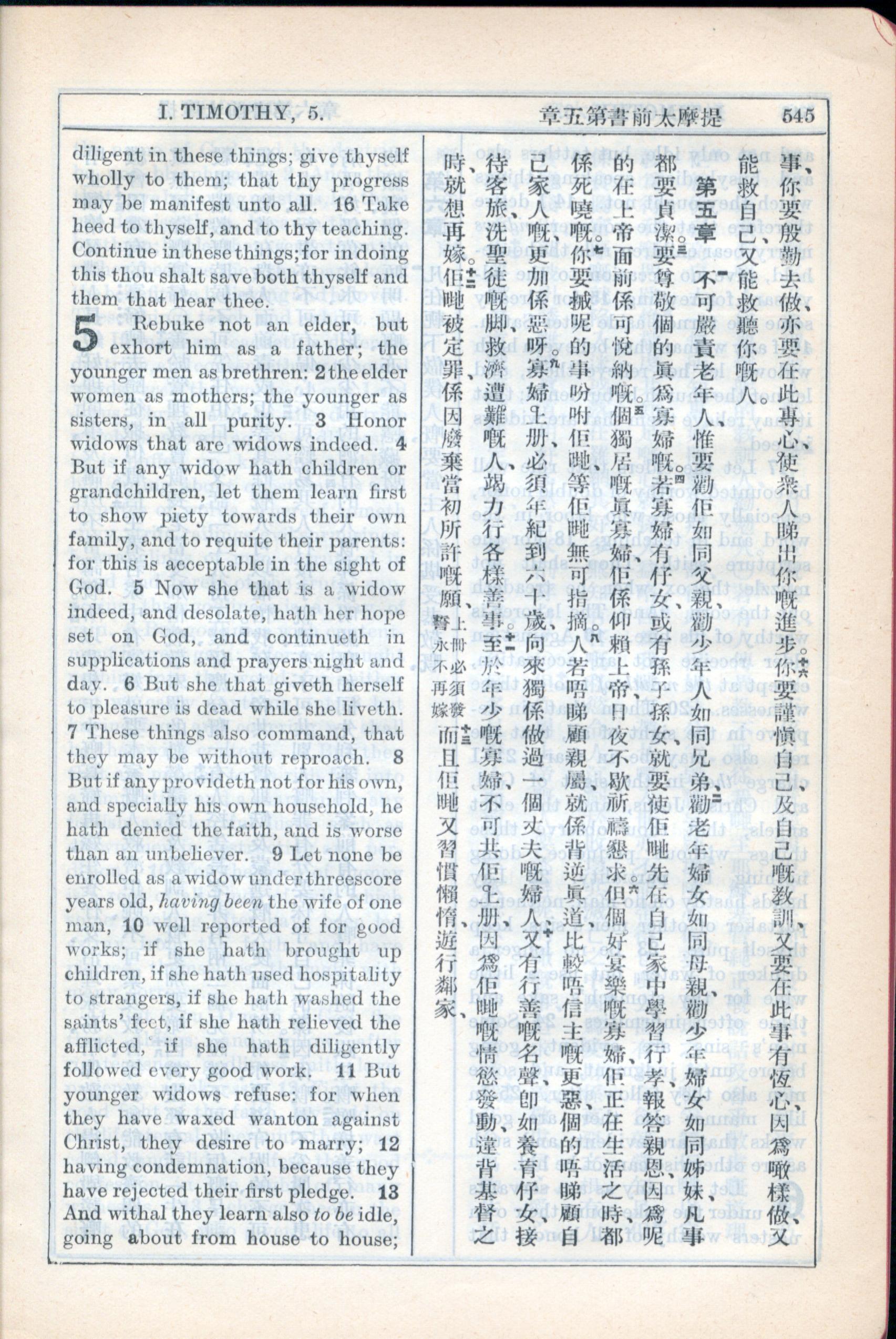 1931年新約全書廣東話新譯本與美國新譯英文 提摩太前書 4 章 15 節到 5 章 13 節