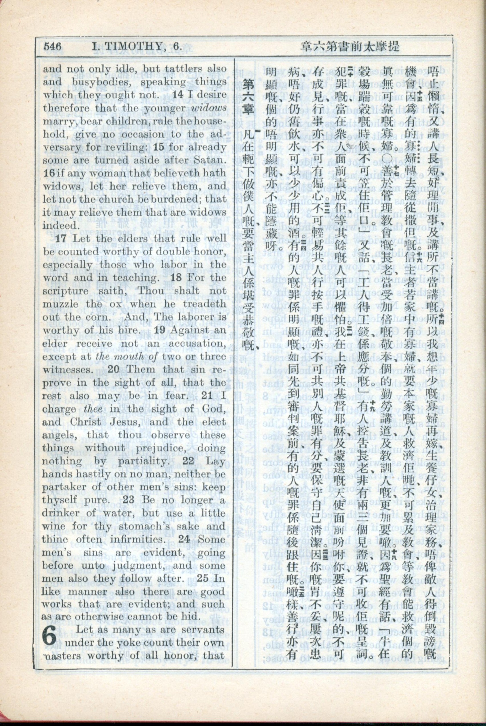 1931年新約全書廣東話新譯本與美國新譯英文 提摩太前書 5 章 14 節到 6 章 1 節