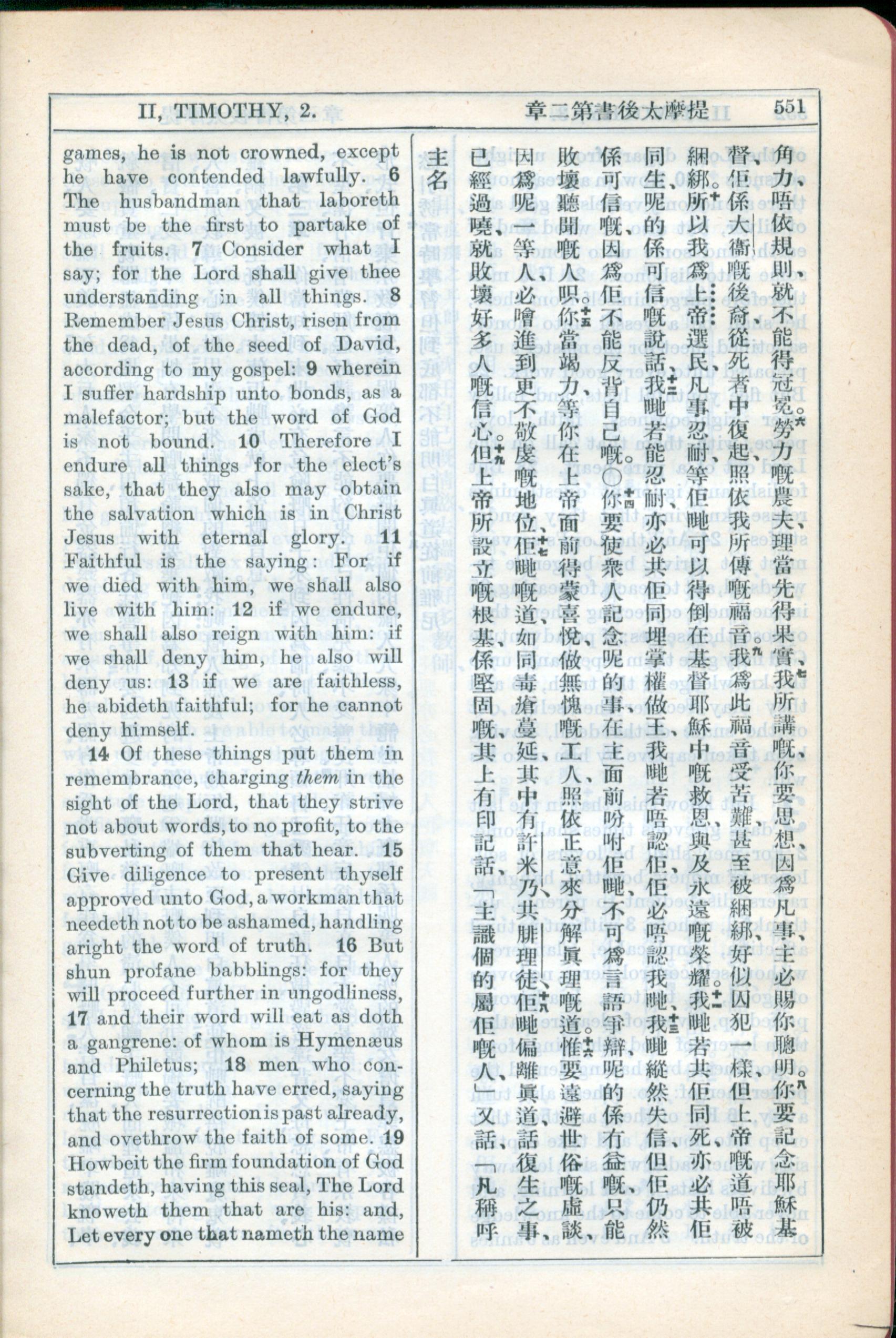 1931年新約全書廣東話新譯本與美國新譯英文 提摩太後書 2 章 6 節到 2 章 19 節