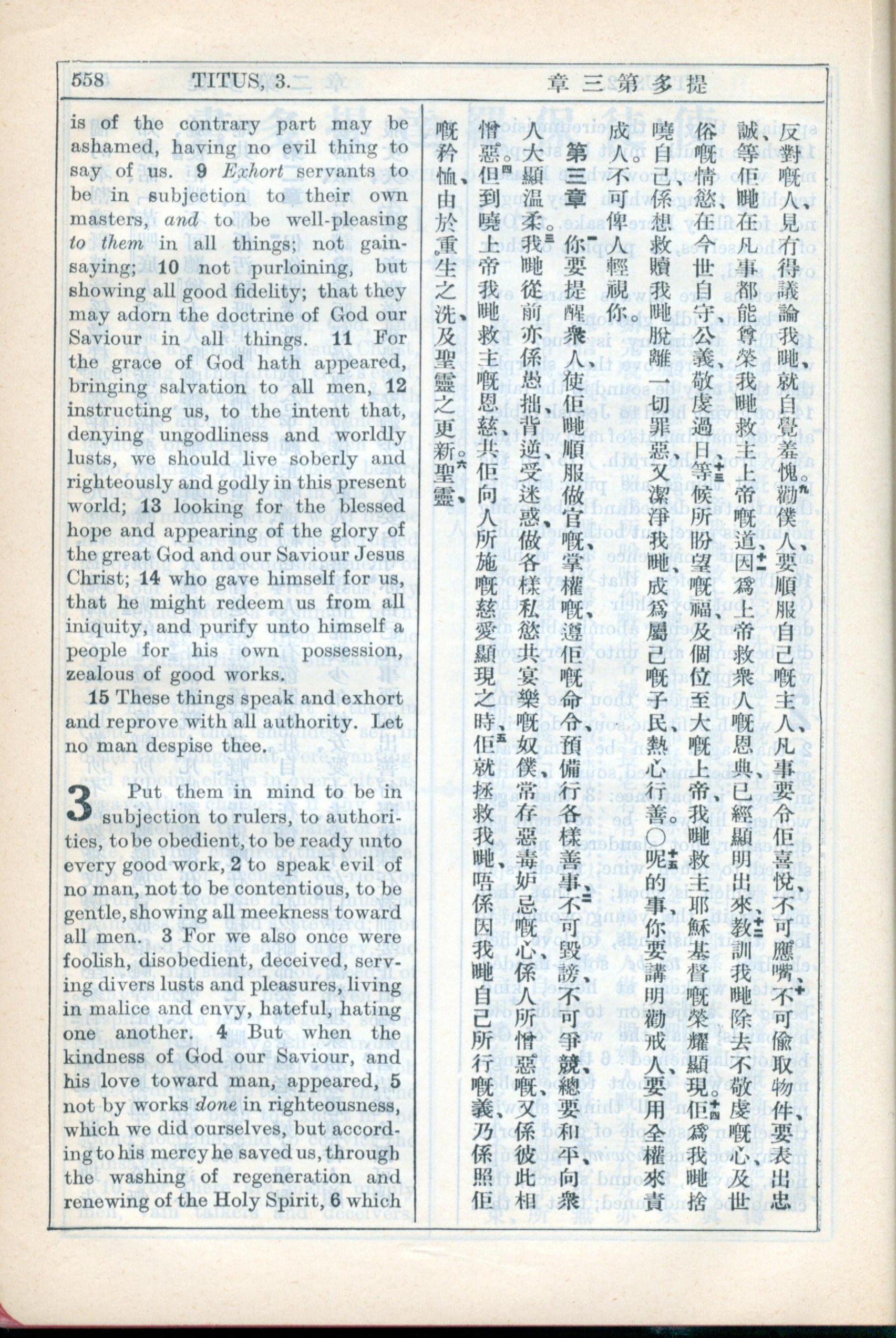 1931年新約全書廣東話新譯本與美國新譯英文 提多書 2 章 9 節到 3 章 5 節