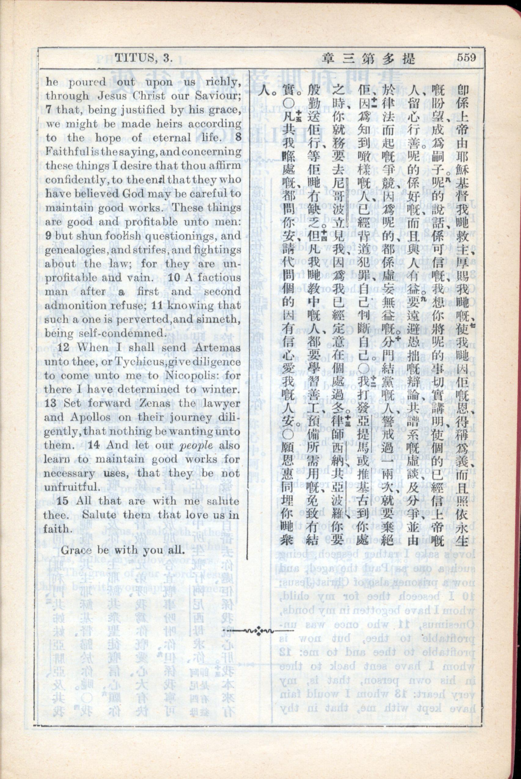 1931年新約全書廣東話新譯本與美國新譯英文 提多書 3 章 6 節到 3 章 15 節