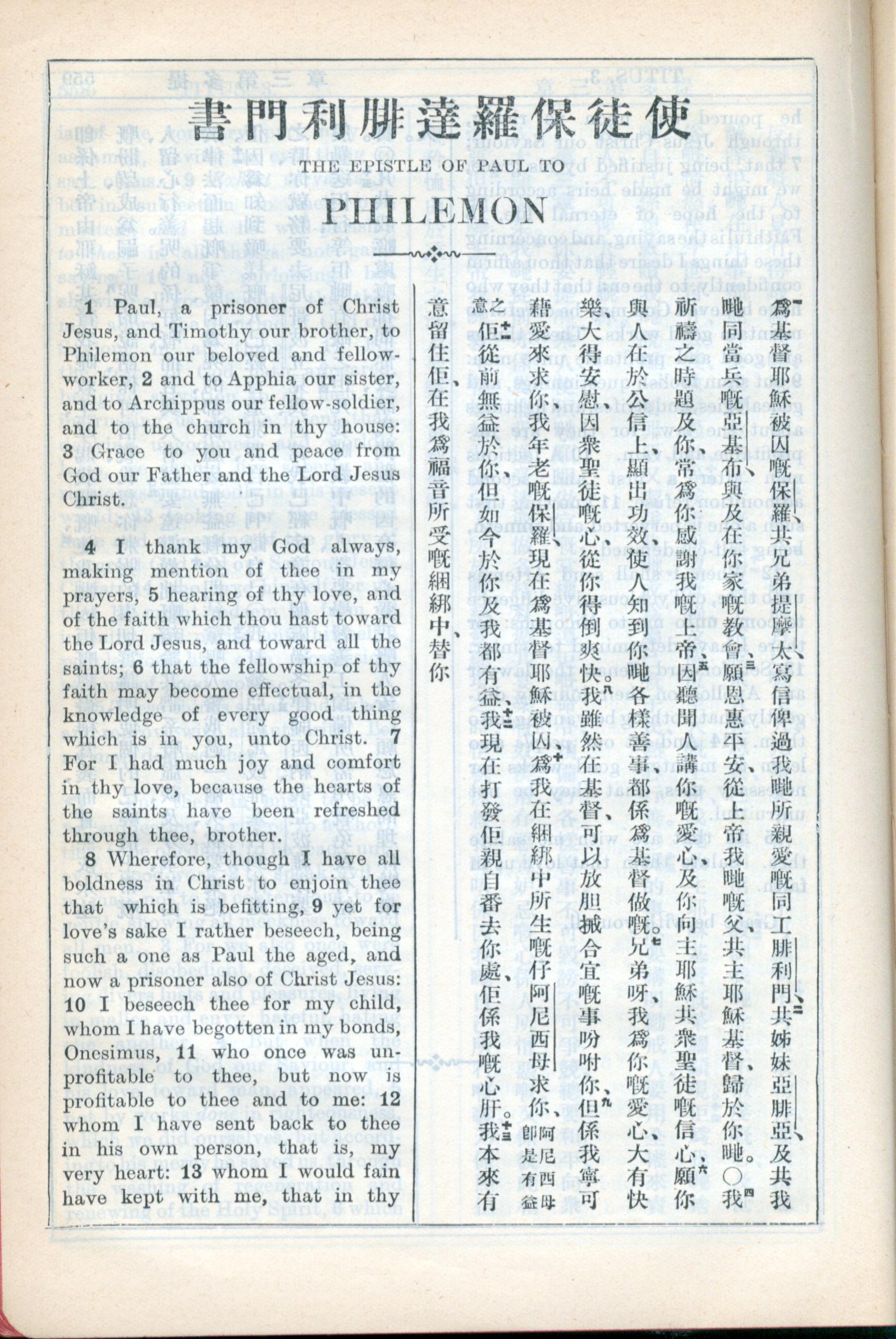1931年新約全書廣東話新譯本與美國新譯英文 腓利門書 1 章 1 節到 1 章 13 節