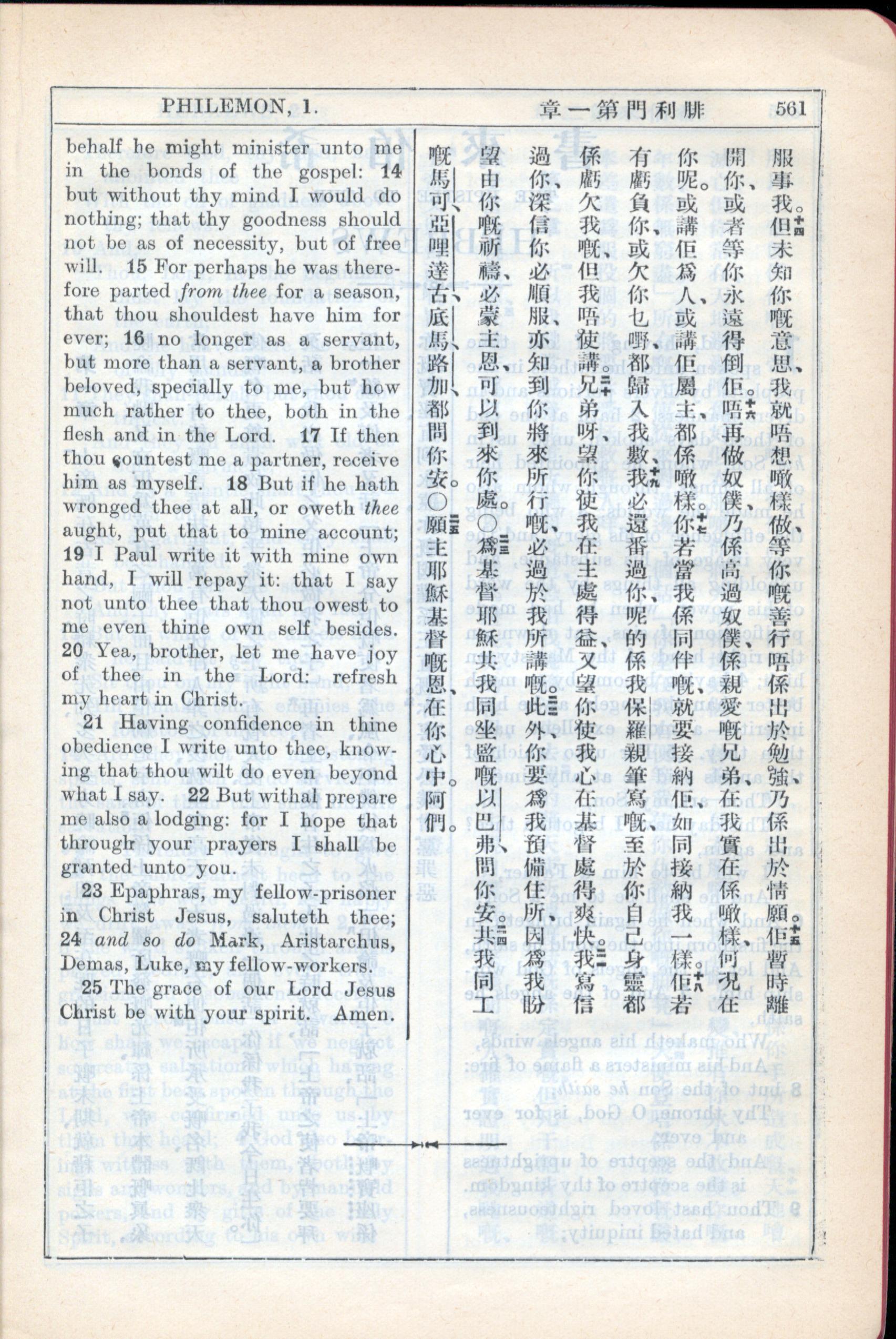 1931年新約全書廣東話新譯本與美國新譯英文 腓利門書 1 章 14 節到 1 章 25 節