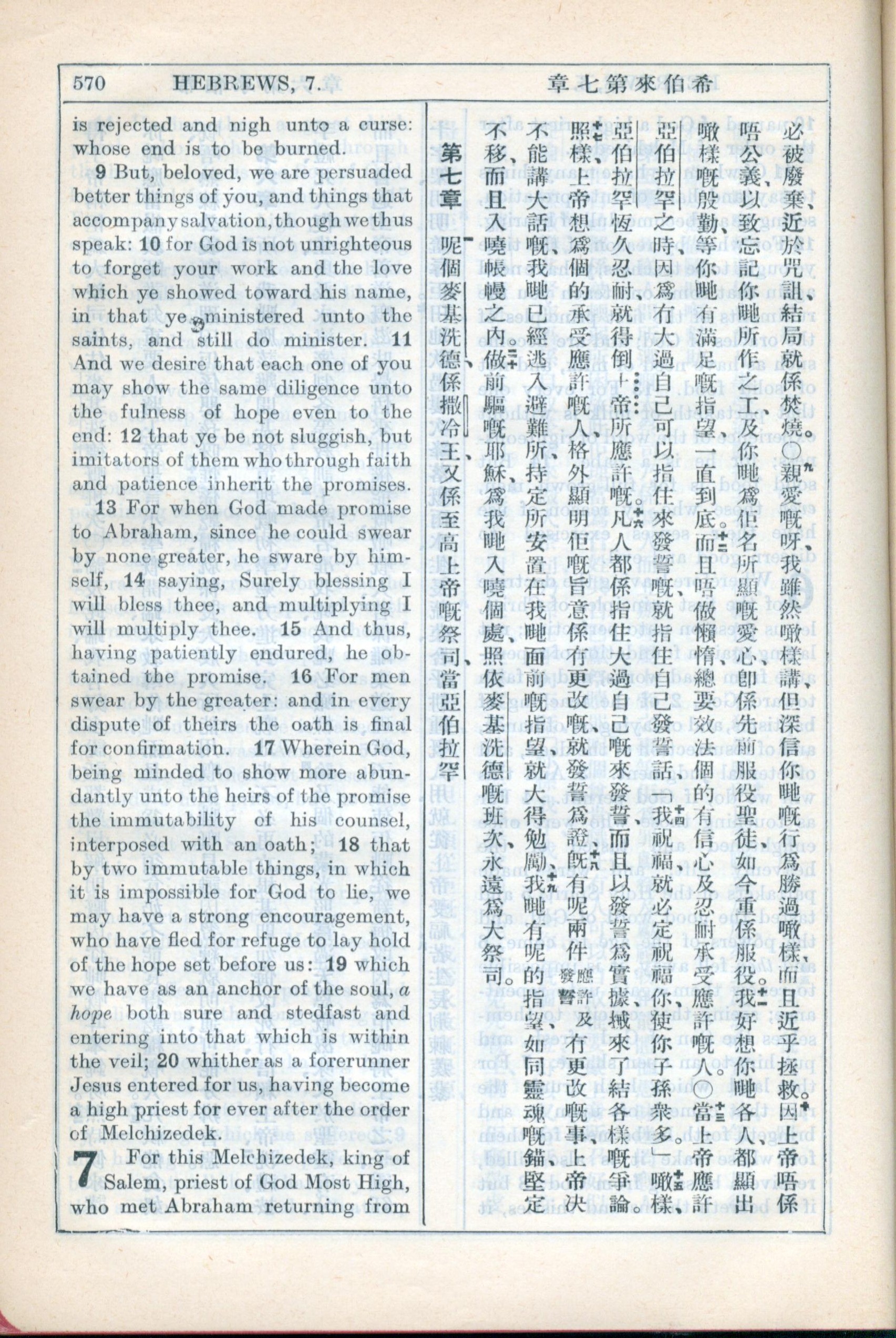 1931年新約全書廣東話新譯本與美國新譯英文 希伯來書 6 章 9 節到 7 章 1 節