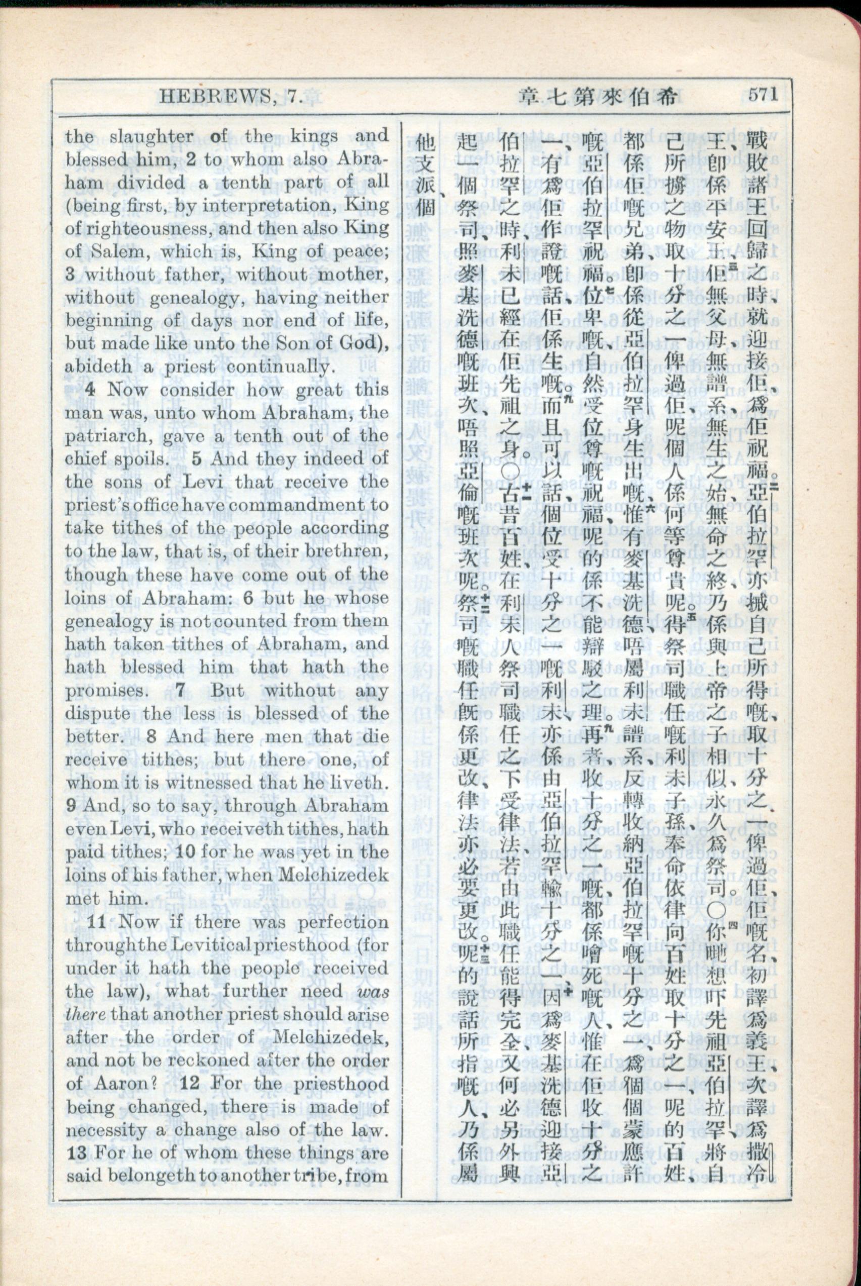 1931年新約全書廣東話新譯本與美國新譯英文 希伯來書 7 章 2 節到 7 章 13 節