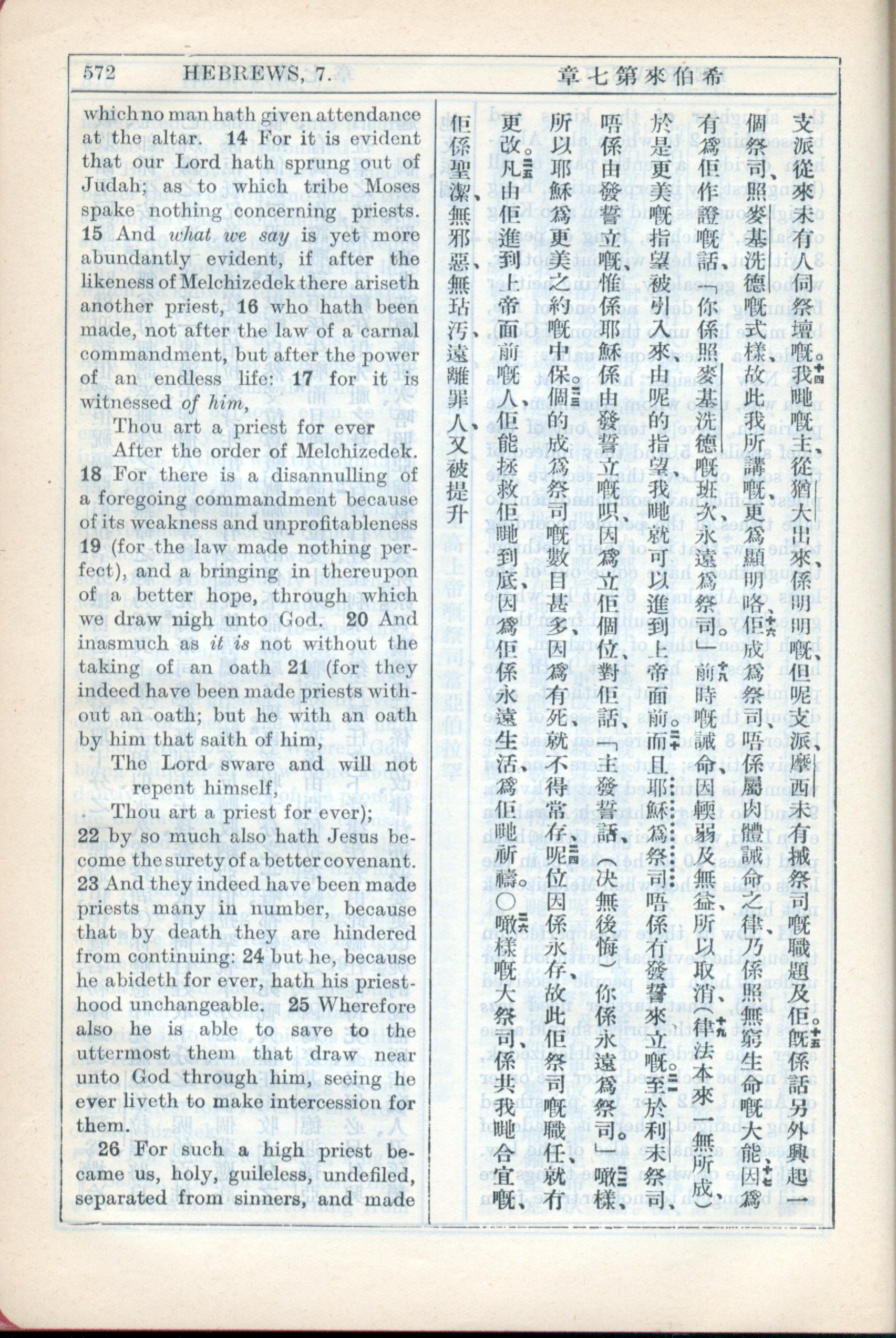 1931年新約全書廣東話新譯本與美國新譯英文 希伯來書 7 章 14 節到 7 章 26 節
