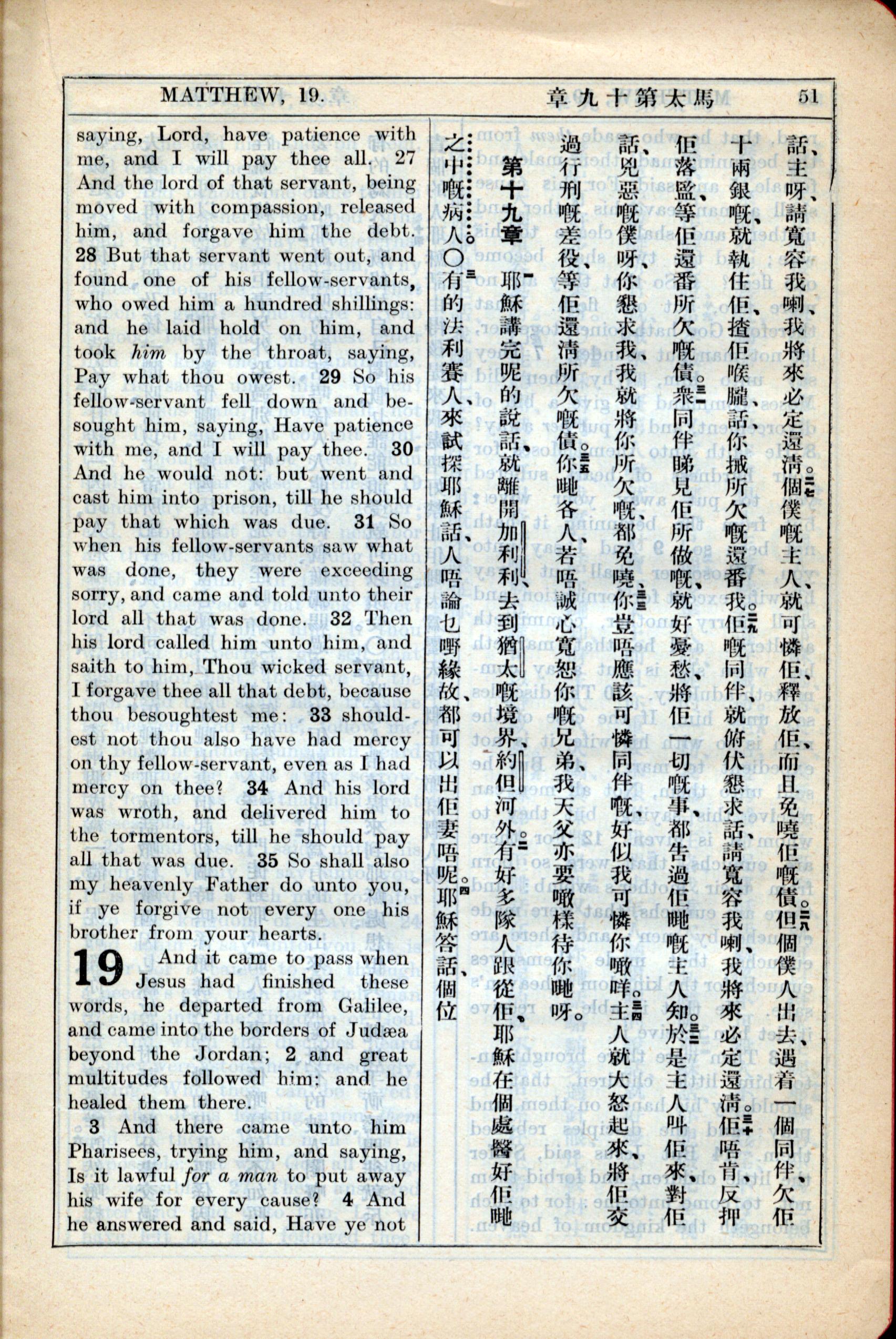 1931年新約全書廣東話新譯本與美國新譯英文 馬太福音 18 章 27 節到 19 章 3 節