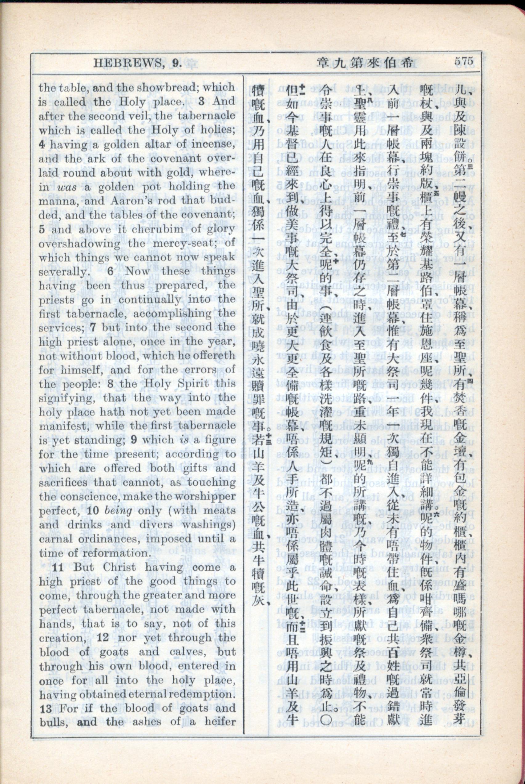 1931年新約全書廣東話新譯本與美國新譯英文 希伯來書 9 章 3 節到 9 章 13 節