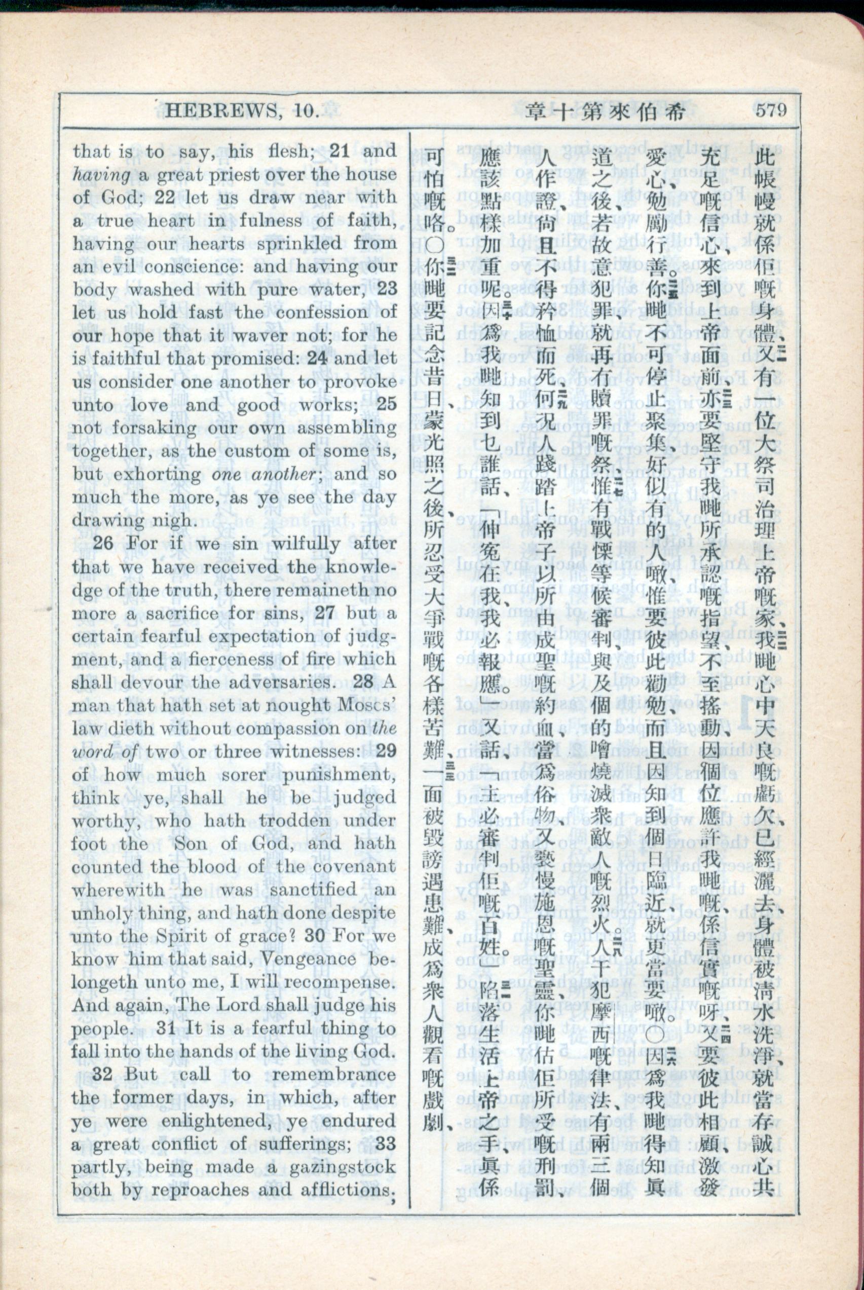 1931年新約全書廣東話新譯本與美國新譯英文 希伯來書 10 章 21 節到 10 章 33 節