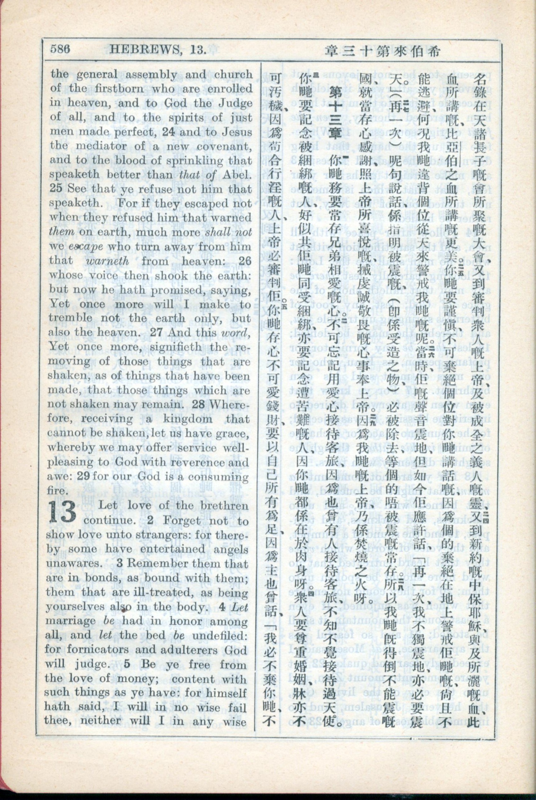 1931年新約全書廣東話新譯本與美國新譯英文 希伯來書 12 章 23 節到 13 章 5 節