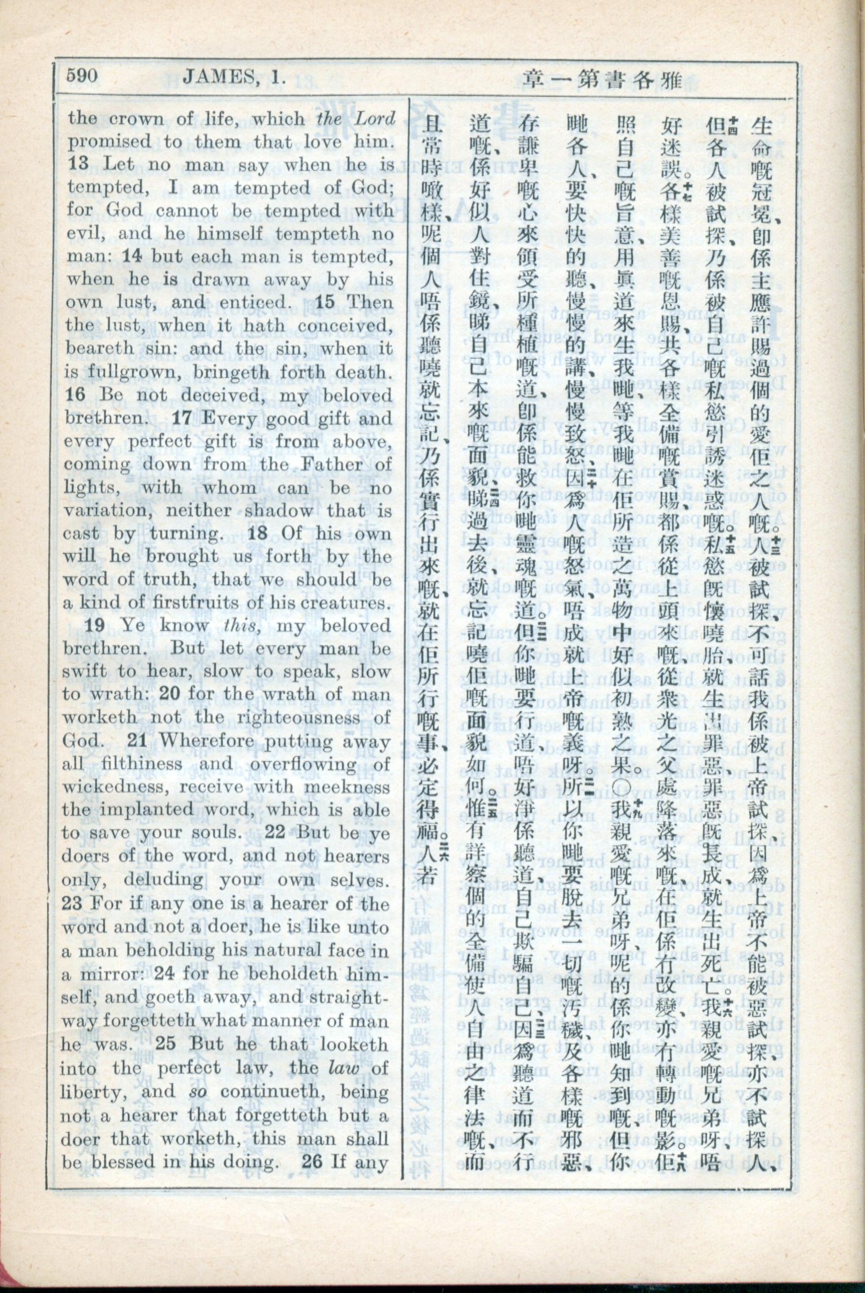 1931年新約全書廣東話新譯本與美國新譯英文 雅各書 1 章 13 節到 1 章 25 節