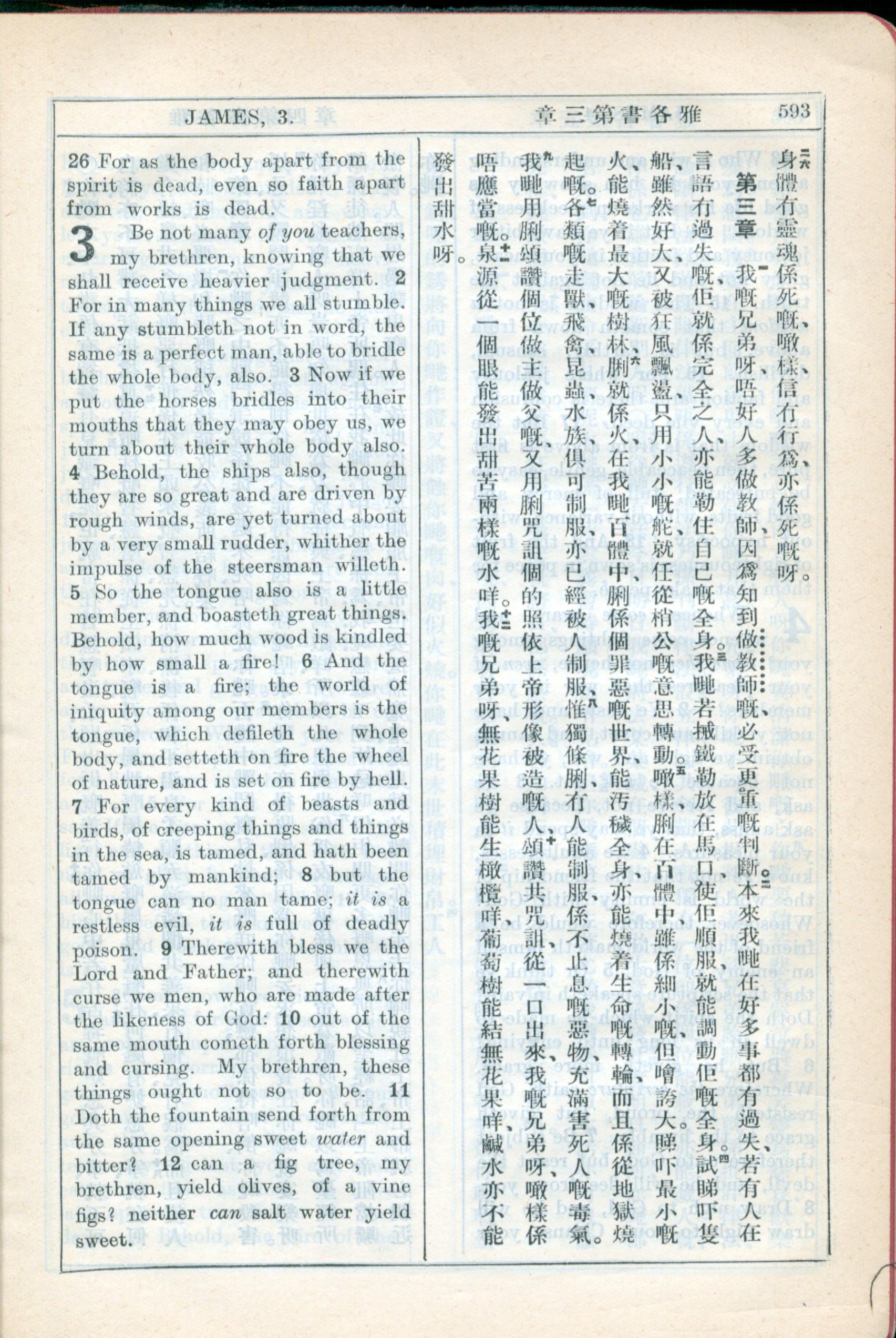 1931年新約全書廣東話新譯本與美國新譯英文 雅各書 2 章 26 節到 3 章 12 節