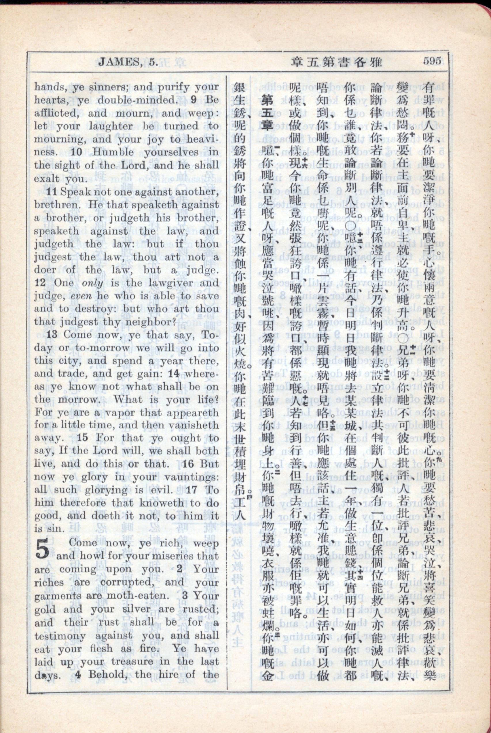 1931年新約全書廣東話新譯本與美國新譯英文 雅各書 4 章 9 節到 5 章 3 節