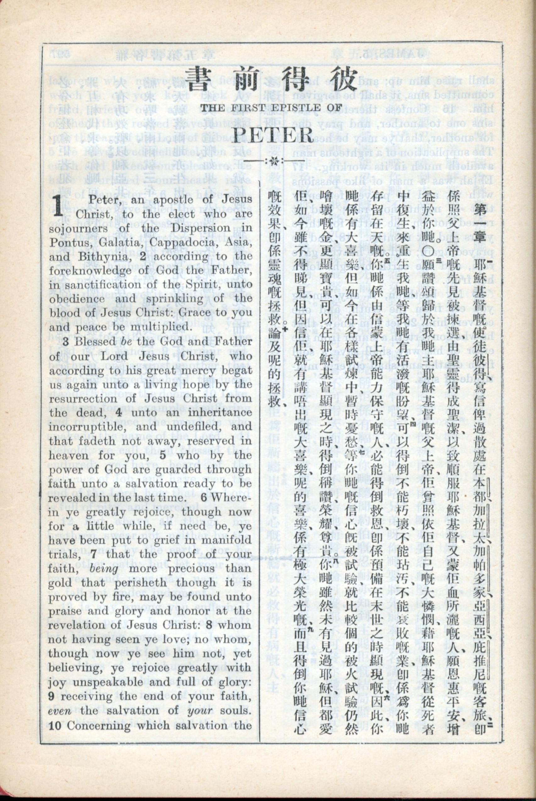 1931年新約全書廣東話新譯本與美國新譯英文 彼得前書 1 章 1 節到 1 章 10 節