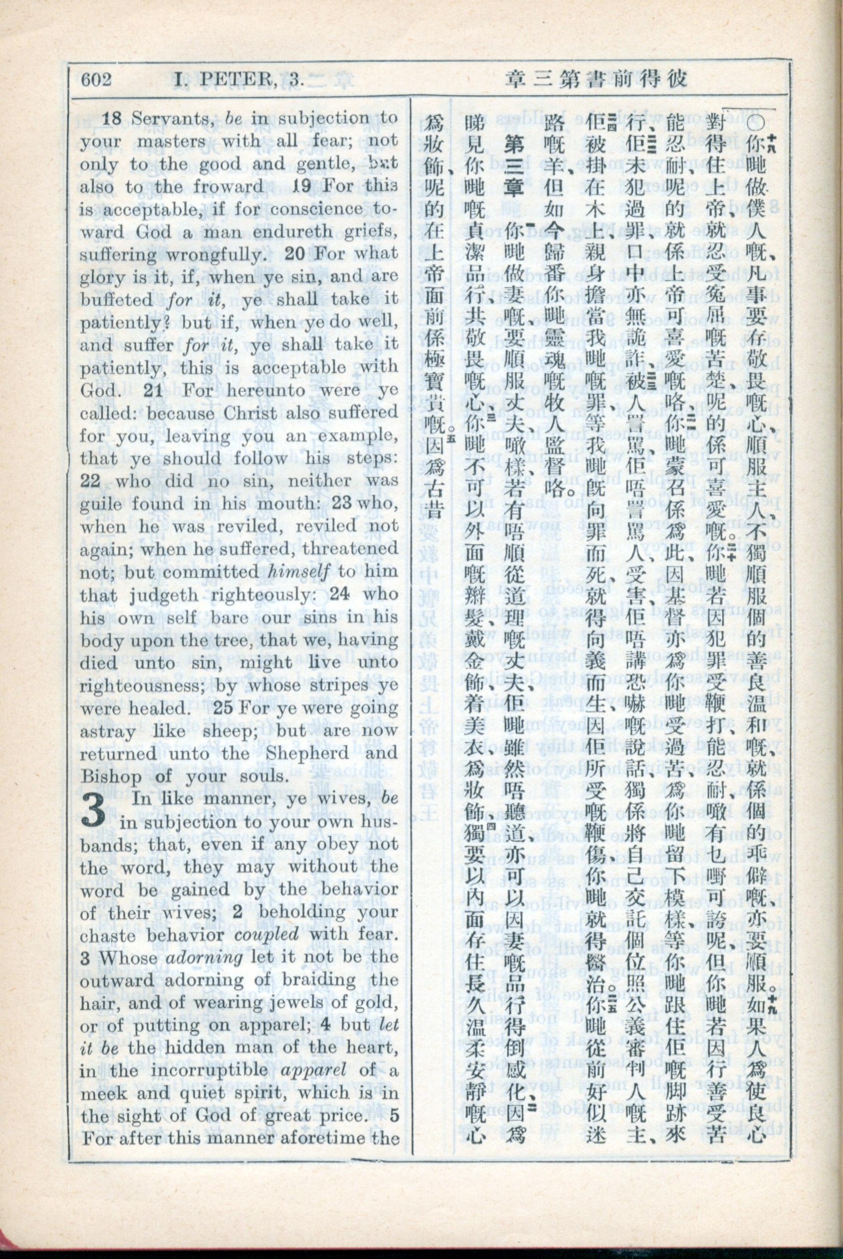 1931年新約全書廣東話新譯本與美國新譯英文 彼得前書 2 章 18 節到 3 章 5 節