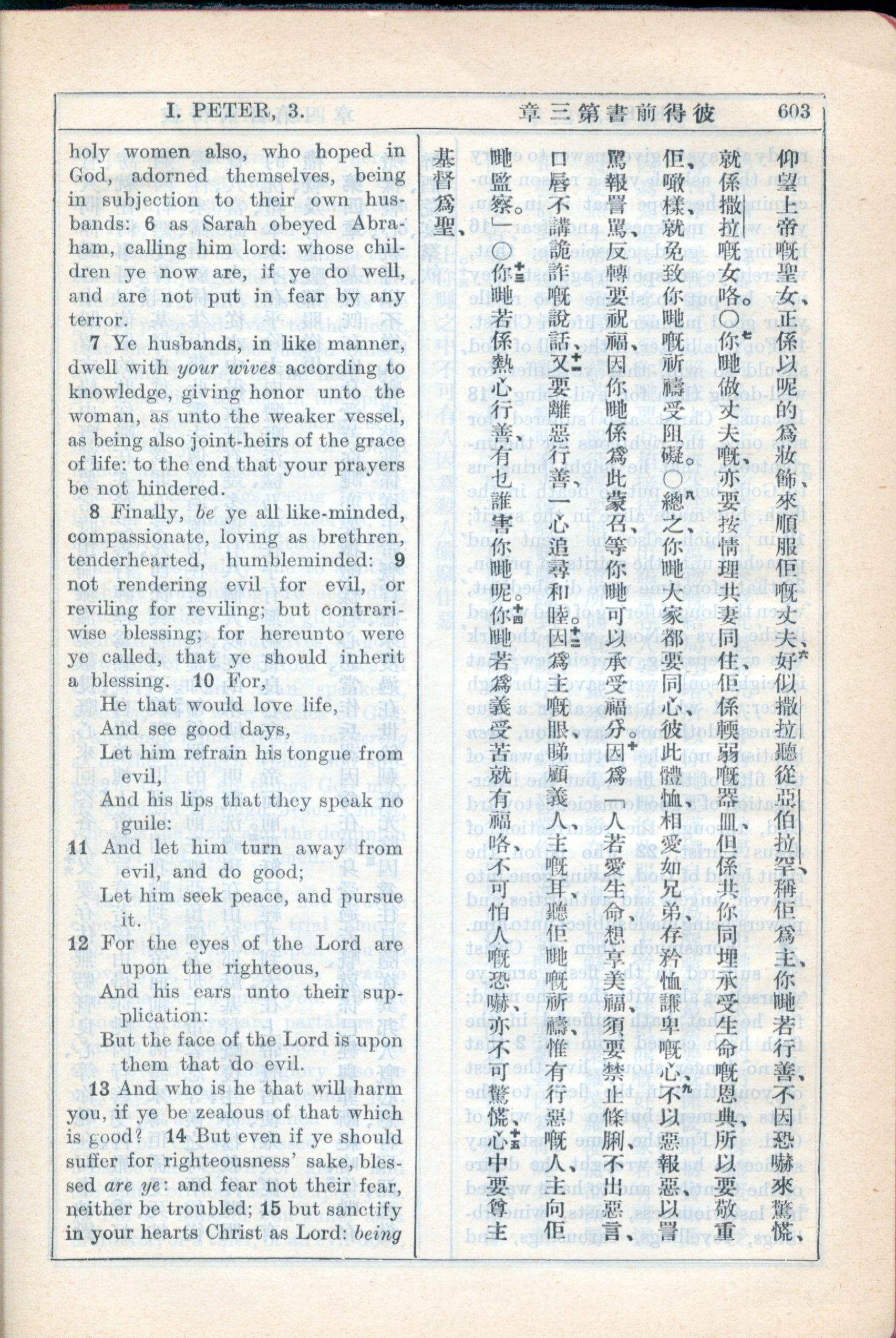 1931年新約全書廣東話新譯本與美國新譯英文 彼得前書 3 章 6 節到 3 章 15 節