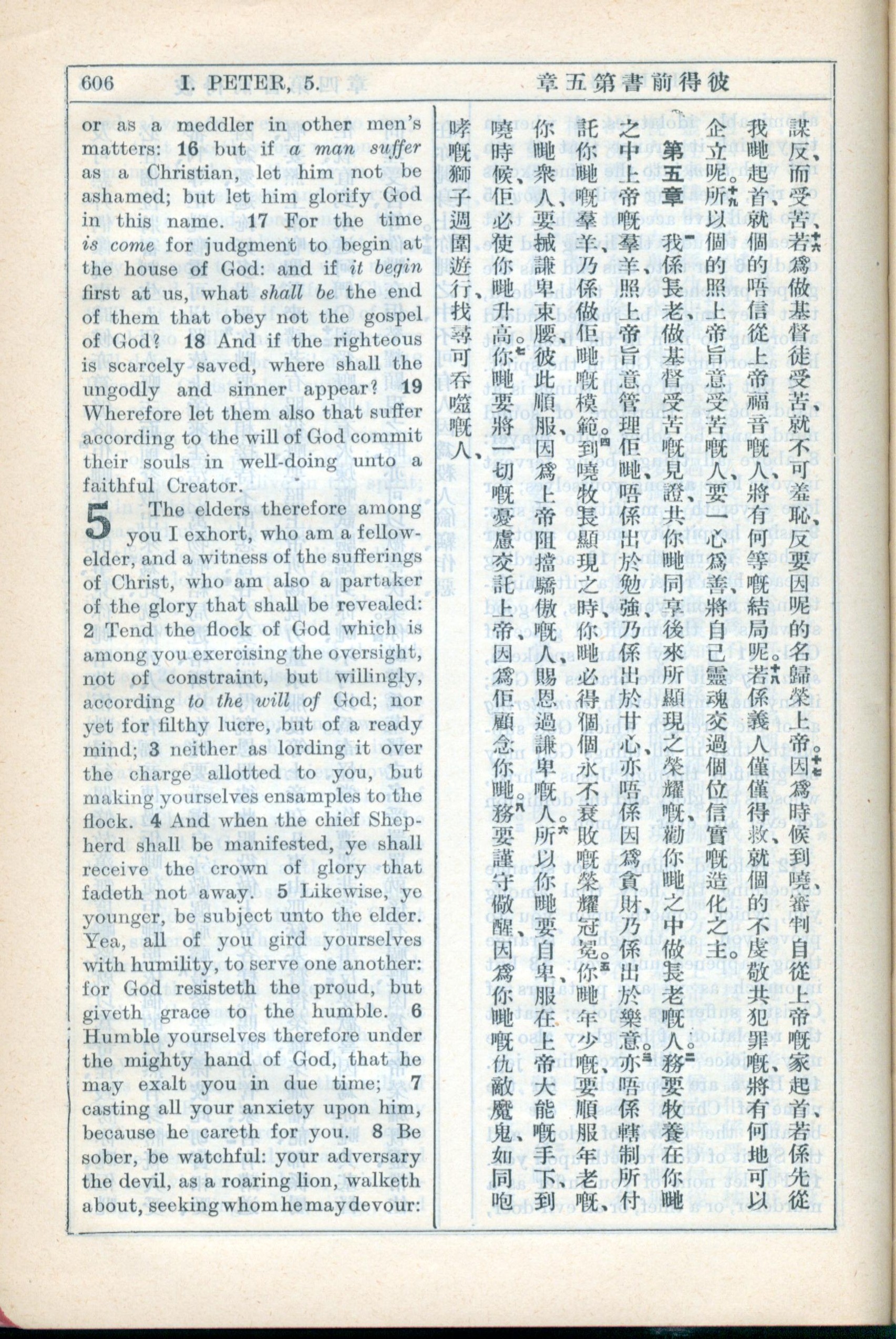 1931年新約全書廣東話新譯本與美國新譯英文 彼得前書 4 章 16 節到 5 章 8 節