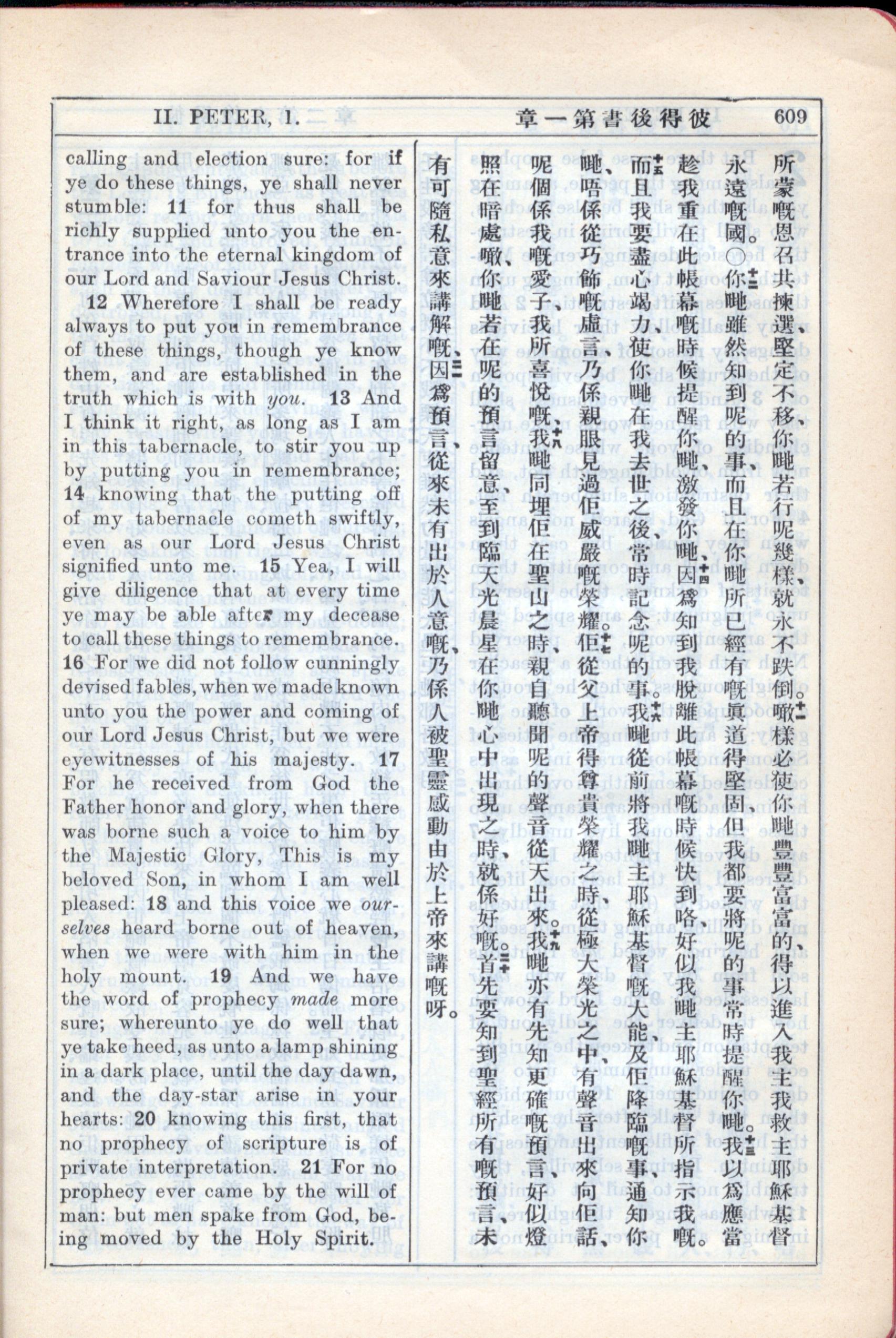 1931年新約全書廣東話新譯本與美國新譯英文 彼得後書 1 章 11 節到 1 章 21 節